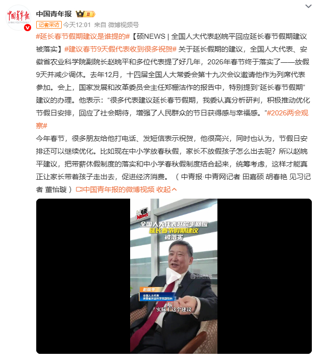 建议春节9天假代表收到很多祝贺春节申遗成功后的首个长假,9天安排藏着文化深意。赵皖平代表指出,延长假期不仅是“多休几天”,更是对传统年俗的守护——从守岁到拜年,从贴春联到放鞭炮,让春节的仪式感回归生活,让文化自信扎根日常。
