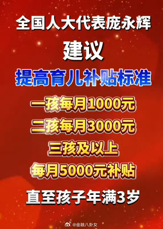 建议三孩每月补贴5000元至3岁全国人大代表庞永辉:建议三孩家庭每月补贴5000元至孩子3岁,对多孩家庭实施所得税、社保减免