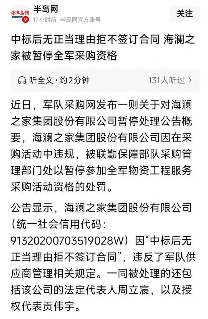 海澜之家被全军拉黑!中标后故意放军队鸽子,企业个人遭“双罚” 海澜之家中标拒签被全军拉黑的事件,看似是一起普通的商业违约,实则戳中了很多企业的痛点:契约精神的缺失。 在市场经济里,诚信是底线,规则是红线,尤其是涉及公共利益、国防安全的采购领域,任何失信行为,都要付出沉重的代价,这不是小题大做,而是维护市场秩序的必然要求。 先给大家科普一下,政府采购和军队采购都有严格的规则,投标中标就相当于立下了具有法律约束力的契约,不是想反悔就能反悔的。 普通商业合作中,中标无正当理由拒签,都会被没收保证金、追究违约责任,放到军队采购领域,性质更为严重,因为这不仅是违约,更是对国防责任的漠视,对公共规则的践踏。 有人觉得,不就是一单合同没签吗,没必要处罚这么重。可大家要明白,军队采购的核心是可靠,不是盈利。 如果企业都能随意中标拒签,今天这家怕亏不干,明天那家产能不够跑路,那国防保障的稳定性就无从谈起。 军方出台严厉处罚,就是要立规矩:不管企业名气多大、实力多强,只要触碰失信红线,就绝不姑息,全军拉黑、纳入失信名单,就是要让失信企业付出应有的代价。 这份处罚的震慑力,不止针对海澜之家一家。同步纳入全国政府采购失信名单,就是要打通信用惩戒的全链条,让失信企业在公共采购领域寸步难行。 这也传递出一个清晰信号:市场经济是信用经济,契约精神不是空洞的口号,而是企业安身立命的根本。不管是大企业还是小企业,都要敬畏规则、信守承诺,别把投标当儿戏,别把契约当摆设。 截至目前,涉事企业仍未给出合理解释,沉默只会消耗仅剩的品牌信誉。对企业而言,犯错不可怕,可怕的是漠视错误、逃避责任。 想要挽回局面,唯有正视问题、拿出诚意,修补信用裂痕。毕竟,在规则面前,没有例外;在诚信面前,人人平等,守住契约精神,才是企业行稳致远的唯一捷径。
