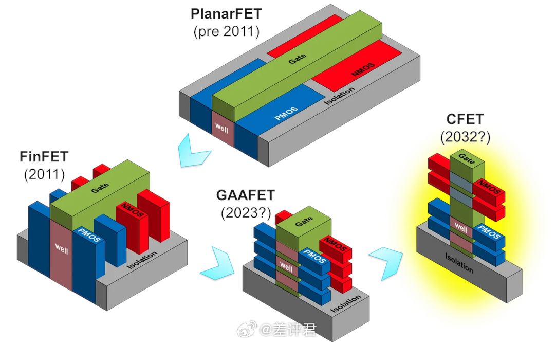 还有一个被越来越频繁提起的新方向就是台积电等巨头反复押注的 CFET(互补场效应晶体管)。相比过去的晶体管密度横向发展、在土地上建平房的方式, CFET的思路,则更像是平地起高楼,通过垂直叠加晶体管的方式,利用三维空间提高晶体管密度。
