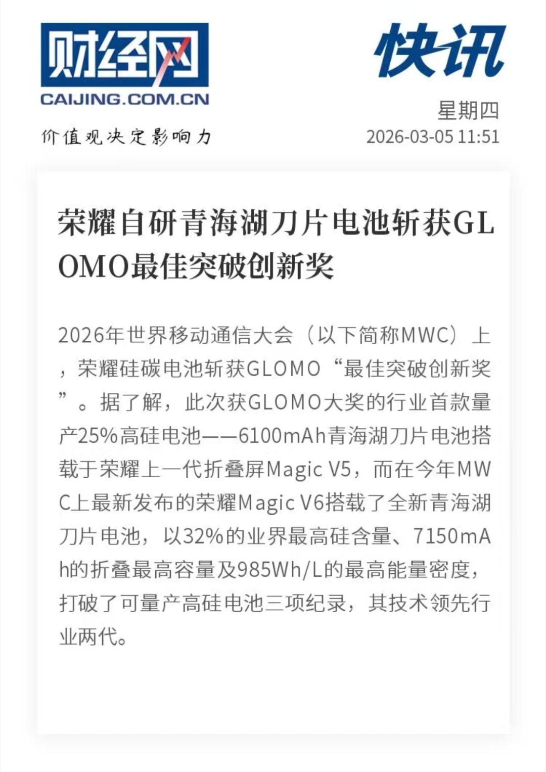 MWC2026上,中国硅碳电池获GLOMO大奖。荣耀的硅碳电池斩获GLOMO“最佳突破创新奖”🎉很好奇Magic V6上面的这电池,用起来续航会有多长🤔