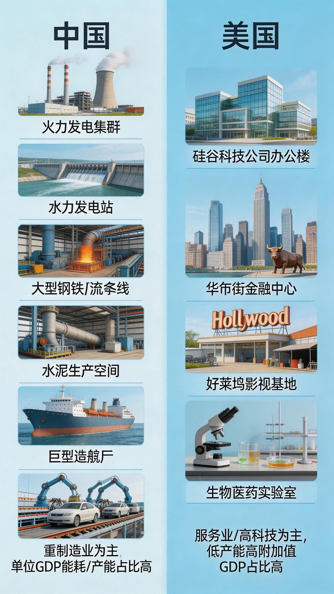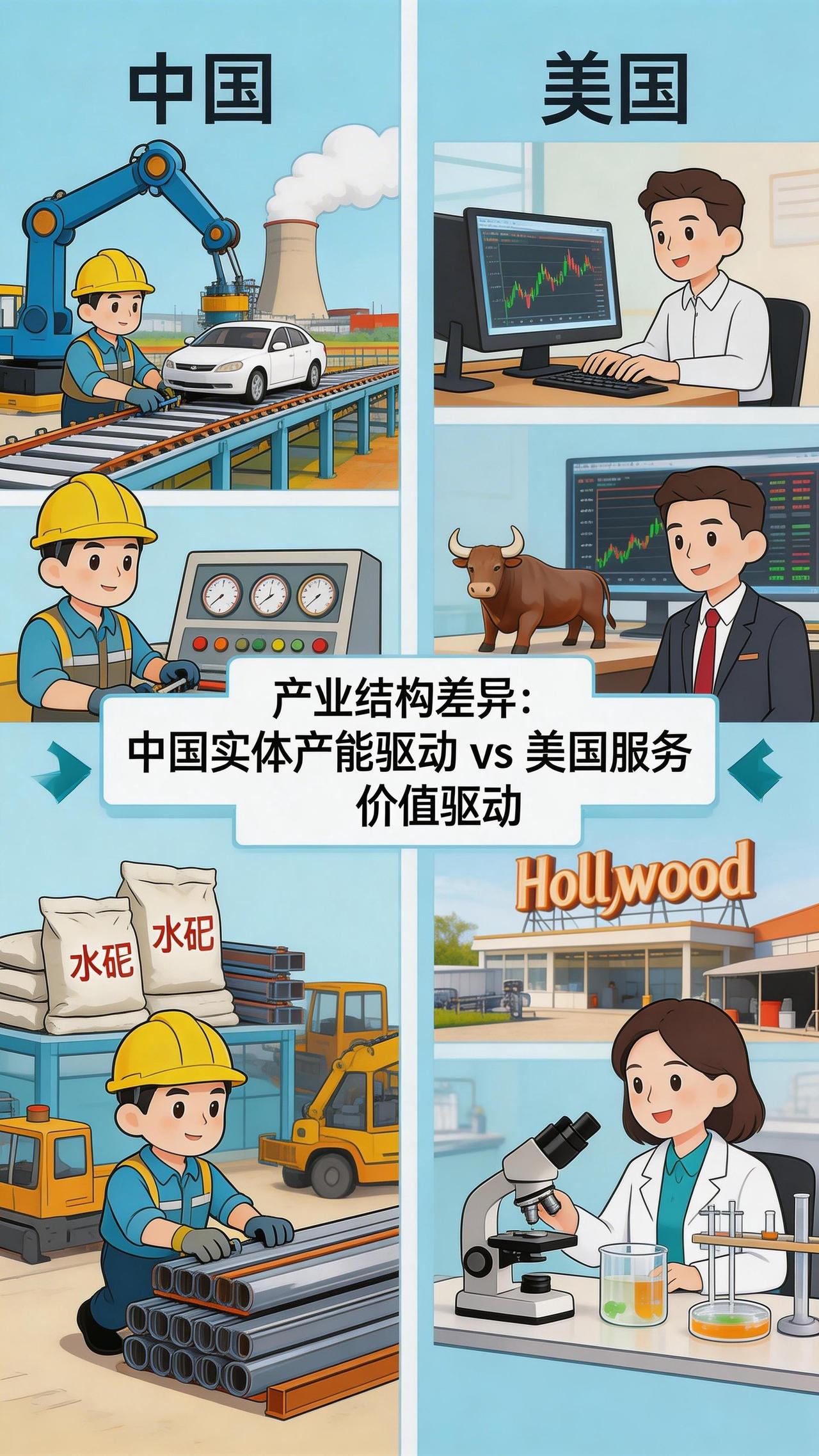 中国的GDP不到美国的70%,请看下组数据如何解释,请给一个合理的解释。 “中国的发电量是美国的两倍,生产的钢是美国的12.6倍,水泥是美国的22倍。中国的造船厂占全球产量的50%以上,而美国的产量微不足道。2023年,中国生产了3020万辆汽车,几乎是美国1060万辆的三倍。GDP2025 有人说是因为产业结构差异造成的,你认为呢?