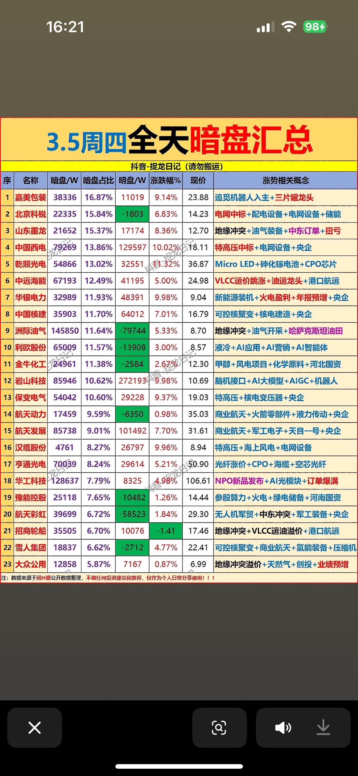 3月5日主力暗净流入与净流出前10名个股梳理,的股市那叫一个热闹!当日全市场69股涨停,连板股7只,封板率达70%。电力、电网板块依旧强势,汉缆股份10天6板,华银电力6天3板,通光线缆20CM2连板。 盘面上,MiniLED概念掀涨停潮,近20股涨停,龙腾光电等多股“20cm”涨停。电网设备延续强势,通光线缆再收获“20cm”涨停。先进封装概念涨超4%,美迪凯“20cm”涨停。半导体相关概念集体走强。 新股N通领北交所上市,开盘涨超50%,它专注汽车内饰件,已进入30余家主机厂供应链。截至3月4日,35股融资净买入额超1亿,东山精密净买入5.73亿居首。这一天的强势股,值得好好研究!