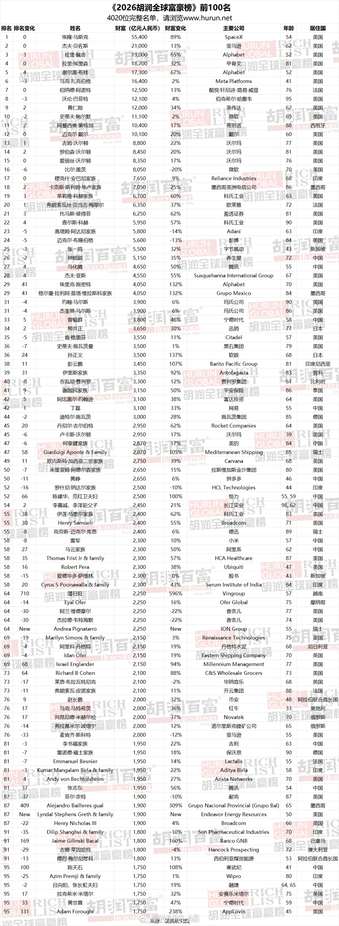 胡润发布 2026全球富豪榜,马斯克蝉联世界首富,财富 5.5 万亿,遥遥领先,张一鸣中国首富,5500 亿,钟睒睒 5150 亿,马化腾 4650 亿,雷军 2300 亿,马云家族 2300 亿。