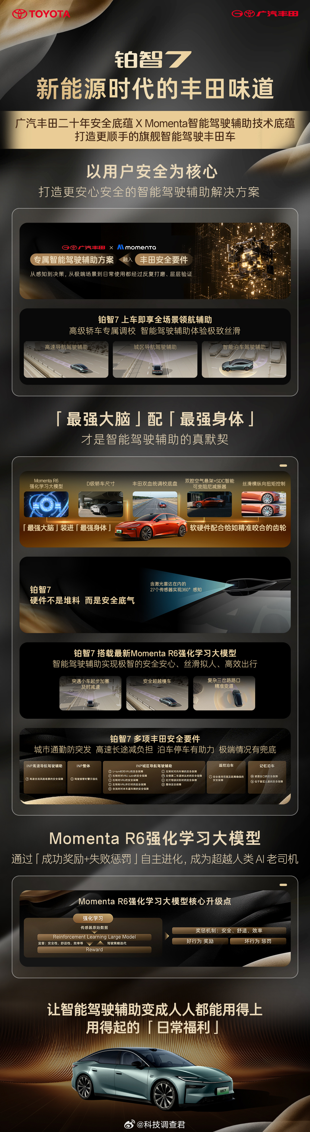 在智能驾驶方面,Momenta与广汽丰田携手定制专属智驾方案,深度融入丰田安全要件。R6强化学习大模型针对铂智7豪华纯电轿车专属优化,软硬件协同高效。新车严格遵循丰田14项ADAS安全要件,不做功能堆砌,专注全场景主动安全守护:城市通勤防突发,高速长途减负担,泊车停车有助力,极端情况有兜底。凭借丰田二十余年安全积淀与Momenta智驾技术,铂智7致力成为更贴合中国用户的旗舰智驾车型,让“有路就有丰田旗舰智驾车”成为现实。丰田铂智7全面开启预售