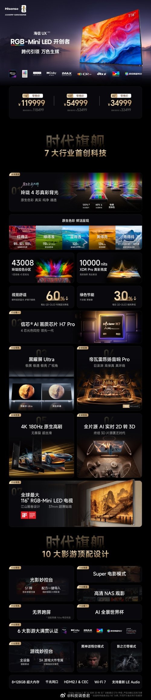 全新海信UX RGB-Mini LED发布,全球首款玲珑四芯真彩 RGB-Mini LED 电视,搭配海信自研的信芯 H7 Pro 芯片,110% BT.2020 广色域,搭配帝瓦雷定制声场与原生 180Hz 高刷,色彩更丰富沉浸,亮色暗色更全能,观看体验更出色