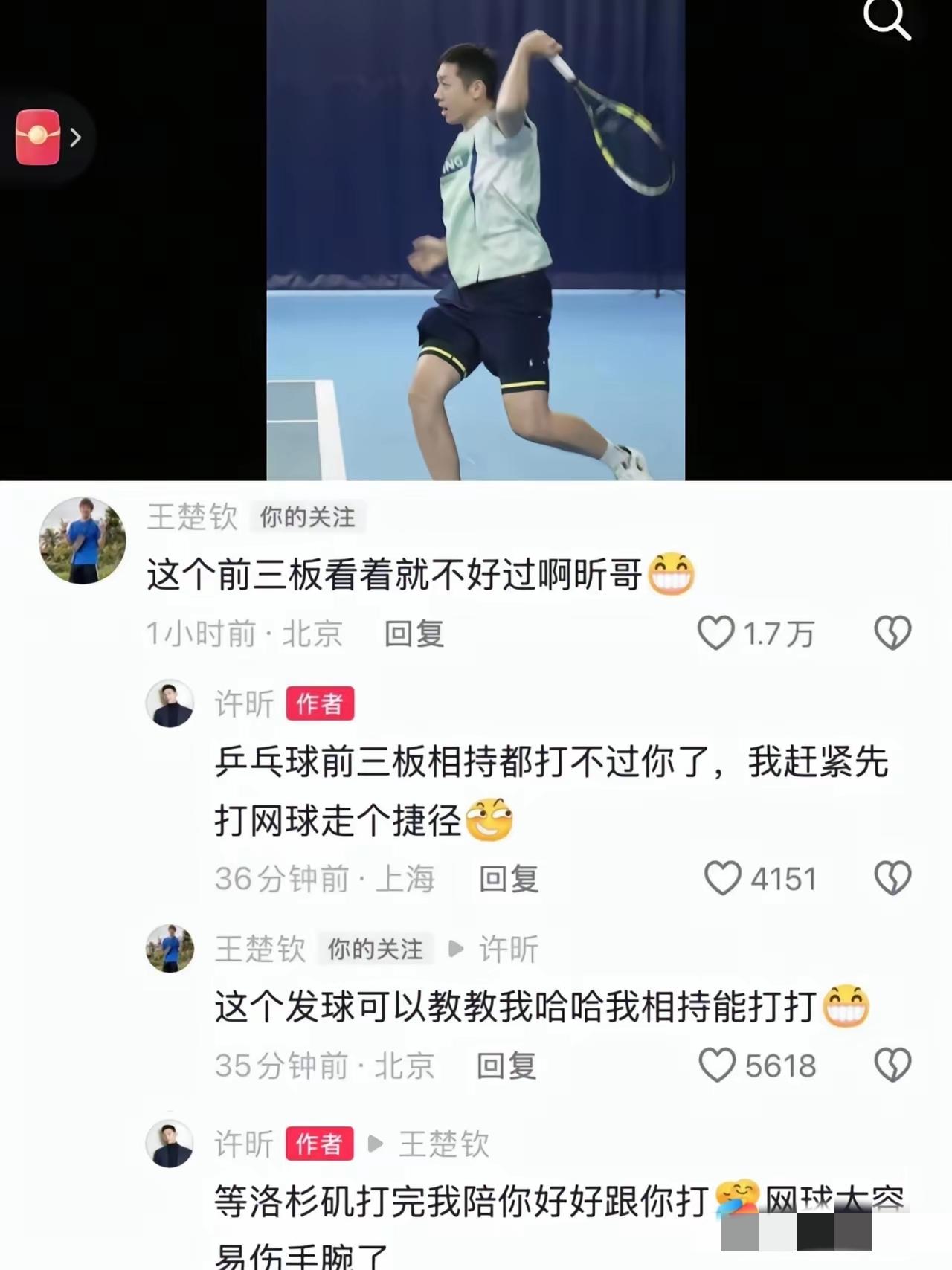 “吃饭不喊我?” “这个前三板看着就不好过呀昕哥。” 这几天王楚钦就像普通人一样上网, 和朋友们互动, 今天他去了“隔壁老樊”的直播间, 安安静静的听了一首歌, 刷了20个小心心, 就像一名普通的歌迷一样。 他曾经说过, 让球迷们关注赛场上的他, 在赛场下, 他就是一个普通人, 这几天, 他上着网, 做着普通人做的事, 只是作为一名体育明星, 想不被关注都很难。 在老樊的直播间, 他没有说话, 但是屏幕上刷满了他的名字, 他的到来也使的直播间的人数剧增, 给好友带来一波流量。 他与许昕的互动让人动容, 许昕说等洛杉矶打完, 他教王楚钦打网球的发球, 因为打网球太容易伤手腕了, 左手将与左手将之间的惺惺相惜, 还有就是为国争光的运动员们之间的互相支持, 让人动容。 还有几天重庆冠军赛就要开打, 希望他们能够稍微的放松几日, 再投入到紧张的比赛之中, 对此您怎么看?