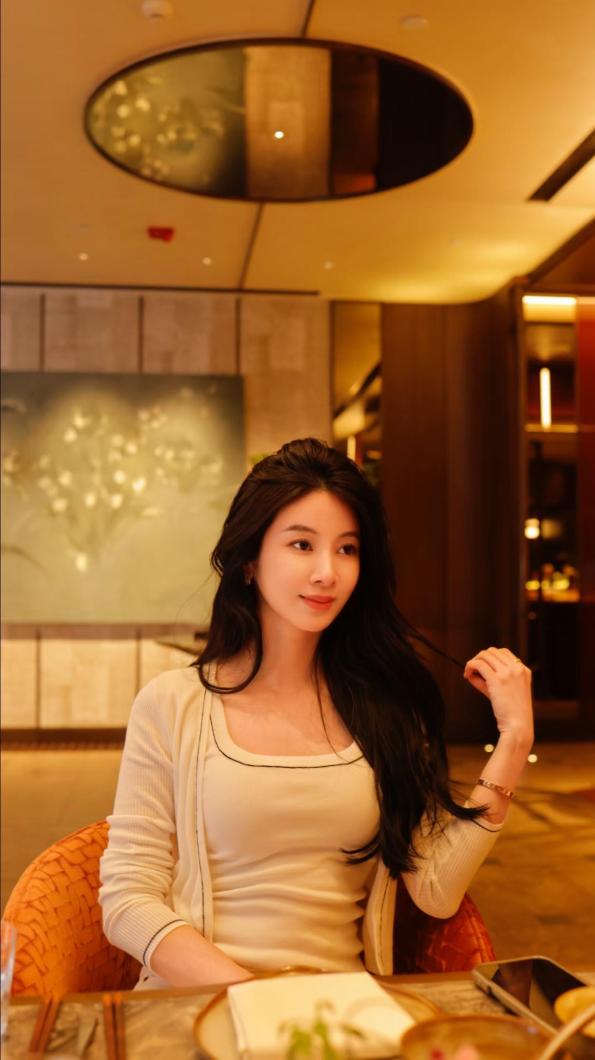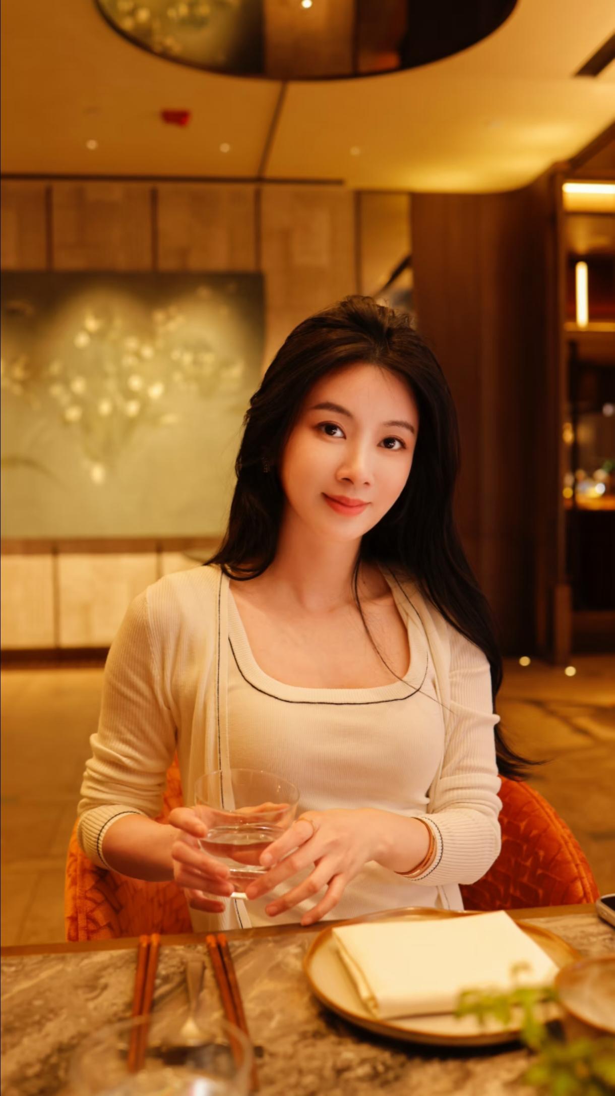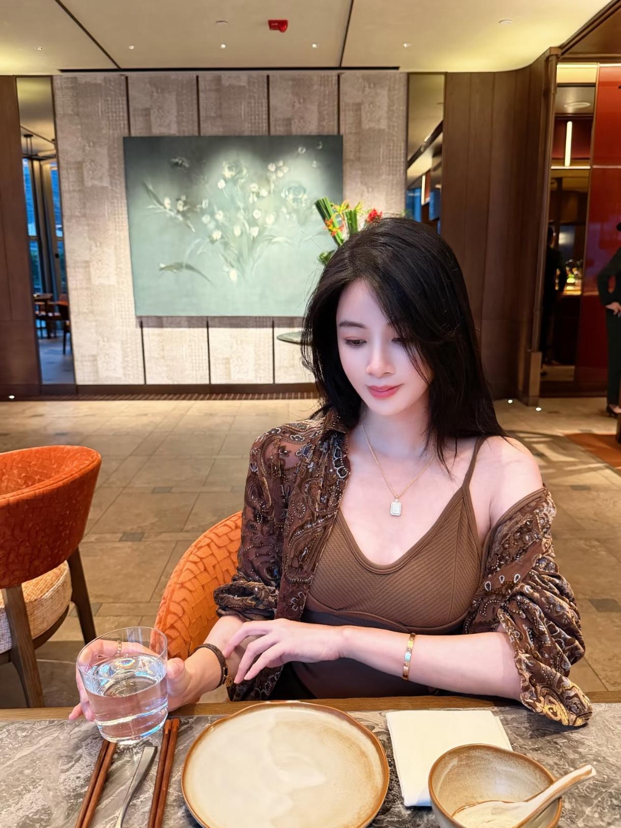 优雅餐厅里,她轻抚眼镜,静享美食时光。。