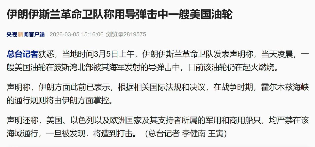 伊朗宣布:摧毁一艘美国油轮,霍尔木兹海峡改为不完全封锁! 据“央视新闻”的报道称,伊朗革命卫队表示,今天(3月5日)凌晨,伊朗海军发射导弹击中了一艘在波斯湾北部美国油轮,目前该油轮仍在起火燃烧。