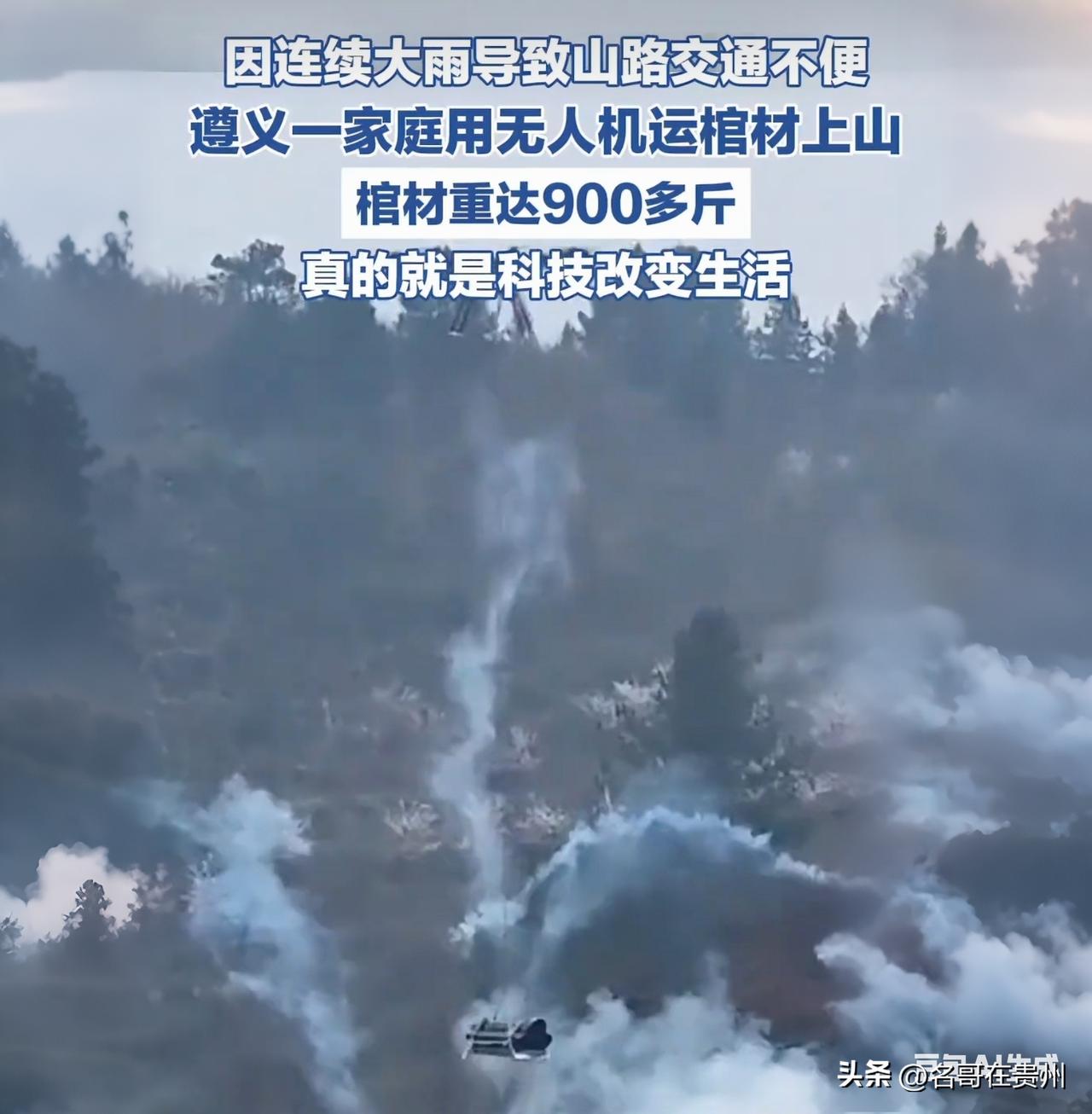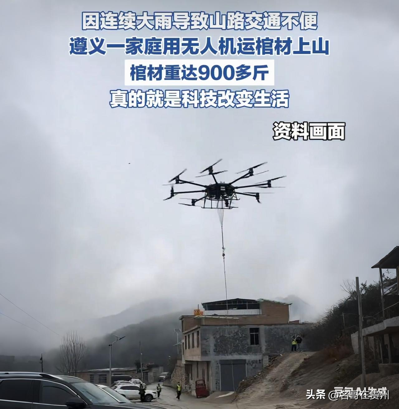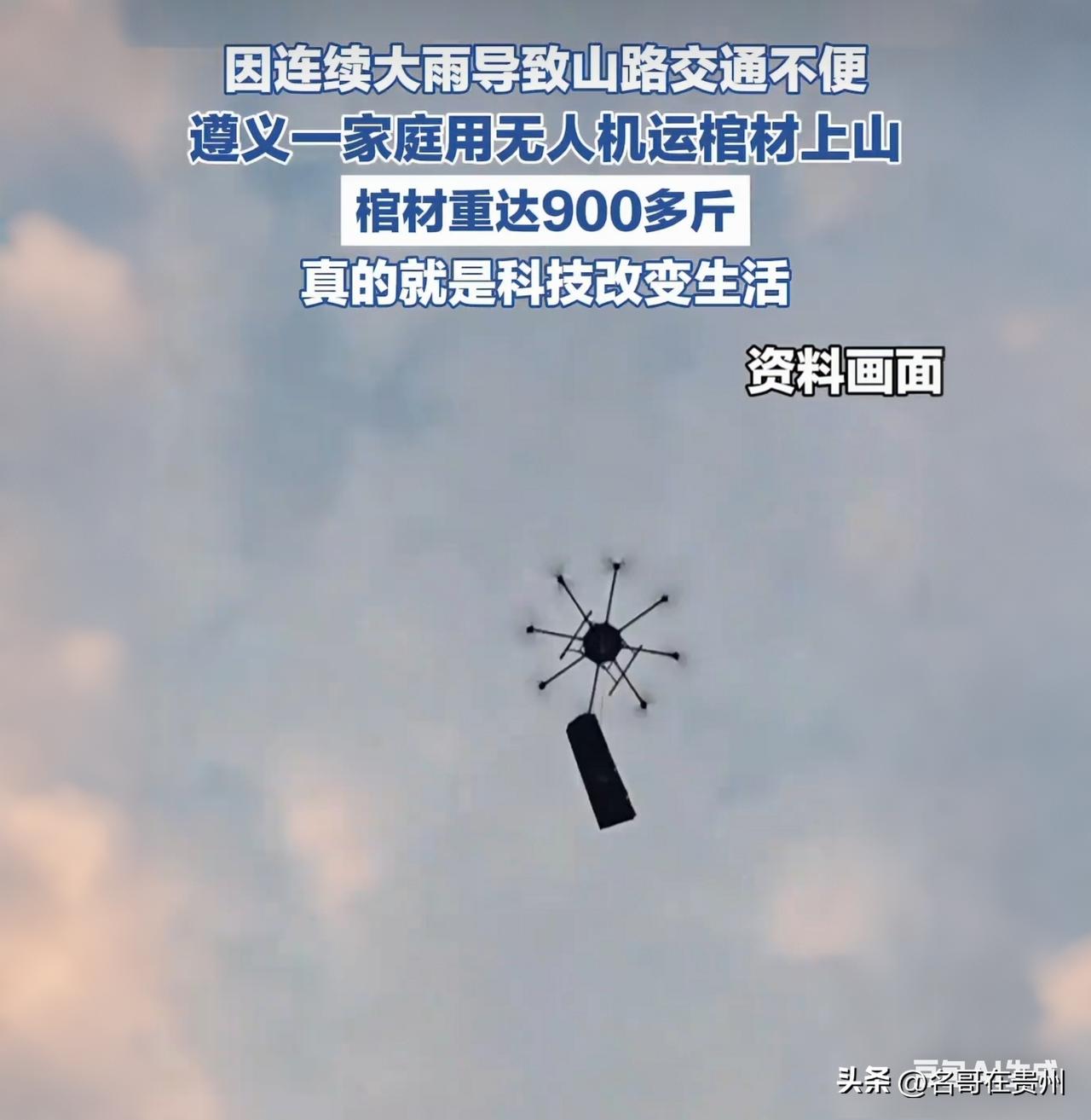 破防了!遵义大雨封山,无人机吊着934斤棺木穿云上山 真开了眼了!贵州遵义一户人家办葬礼,连下9天大雨山路滑得站不住人,934斤的棺木根本抬不动。家属一咬牙,花一万多租了架无人机,直接吊着棺材穿云上山!这一幕把村里老人都看呆了。 我知道很多人看到这第一反应是:这啥操作?殡葬还能这么玩?但听完背后的实情,你可能就不这么想了。 先说那山路有多难走。 贵州山区,本来就是坡陡路窄,连着9天雨一下,那石板路滑得跟溜冰场似的。当地一直是土葬习俗,棺木得抬到半山腰的墓地。可村里年轻力壮的基本都出去打工了,好不容易凑齐的抬棺队,刚起步就滑倒俩,连抬棺的竹杠都咔嚓一声断了。当地还有个老讲究——棺木落地是大忌,这一下可把家属吓得心里咯噔一下。 家属后来跟我说起为啥选无人机。 去年邻村抬棺,也是雨天路滑,连人带棺滑到山沟里,好几个人受了伤。这事儿一直搁在心里。现在这情况,硬抬?万一出了事,对不住帮忙的乡亲,更对不住逝去的老人。思来想去,宁可花点钱,也得让老人安稳上山。 到了出殡那天,那场面是真震撼。 专业的六轴工业无人机调试好,嗡嗡作响,稳稳当当地把棺木吊起来。那天山上雾气腾腾,能见度不高,无人机就带着棺木穿云破雾,沿着规划好的航线,绕过树木山石,慢慢往墓地飞。底下围观的乡亲,一个个仰着脖子看,大气都不敢出。全程两个多小时,安安稳稳,一点岔子没出。 这事一传到网上,网友直接吵翻了。 有人说这是“真正的升天”,老人这辈子没坐过飞机,临走倒圆了飞天梦,也算是一种孝心。也有人觉得不对劲:办白事连抬棺的人都凑不齐,还得靠机器,说出去是不是显得人缘差、子孙没出息?这传统的人情味儿,是不是就没了? 说实话,这两种说法都有道理。但我更愿意换个角度想—— 传统的葬礼,到底是办给活人看的场面,还是让逝者安息的仪式? 如果硬扛着风险,让乡亲们在湿滑山路上玩命,万一出了事,那才真是对不住所有人。无人机飞越高山,载的不只是棺木,更是一家人的哀思和体面。它没丢传统,只是换了一种更安全的方式,把老人送进土里。 哪有什么绝对的传统和新潮。真正的仪式感,从来不是蛮干出来的,而是让逝者安息、让生者心安。 你觉得无人机运棺,是革新还是丢了人情味儿?如果是你家遇到这种事,你会怎么选?评论区聊聊~