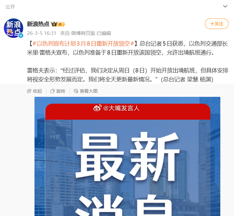 以色列宣布计划3月8日重新开放领空 伊朗宗教领袖被以色列炸死,大量无辜民众被美以炸死炸伤,如果反击过程中,不能迫使以色列民众长期生活受到不利影响,比如让以色列在8日就能这么快重新开放领空,那,伊朗活该被以、美欺负