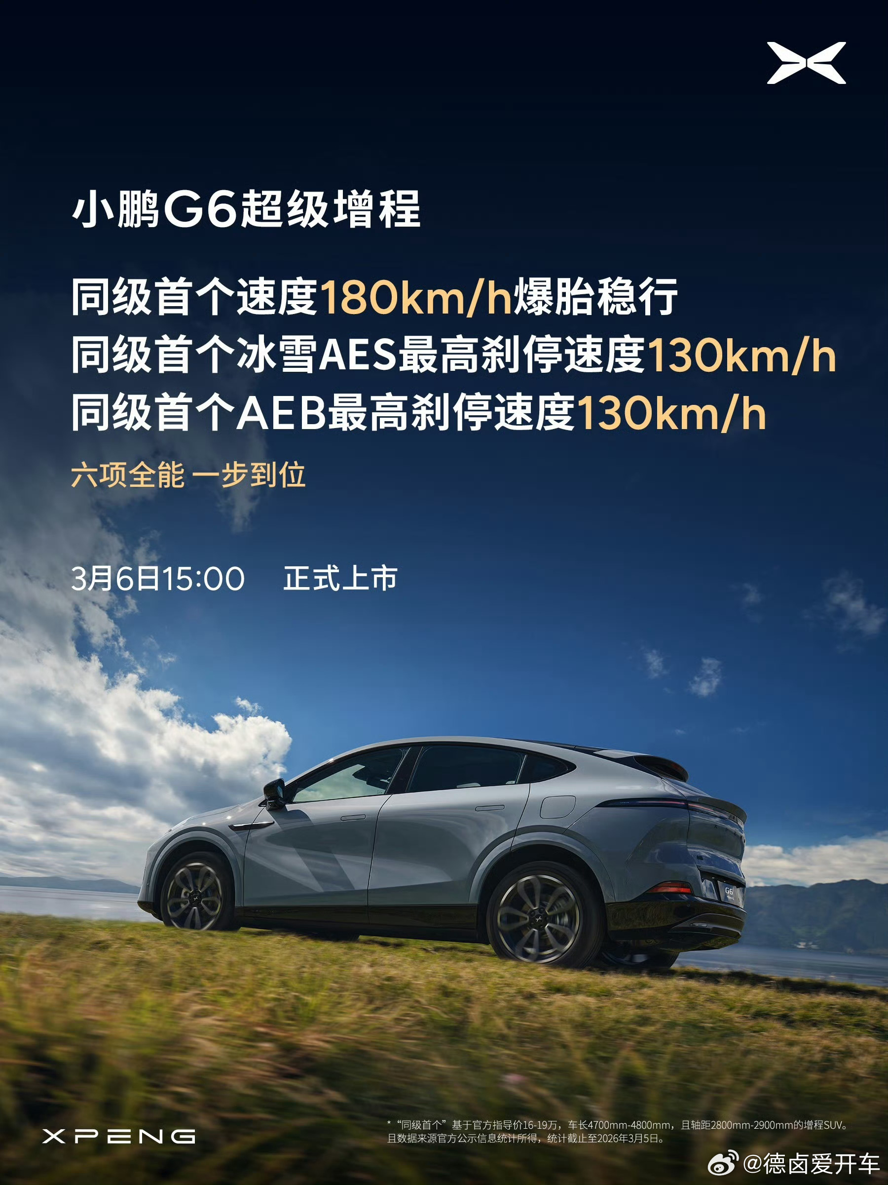按之前惯例,G6增程和纯电同价的概率很大,明天下午G6超级增程上市看是否也这个情况,目前G6纯电Max版售价17.68万-18.68万元,另外可选装1.2万Ultra SE和2万Ultra升级包。小鹏G6超级增程六项全能一步到位