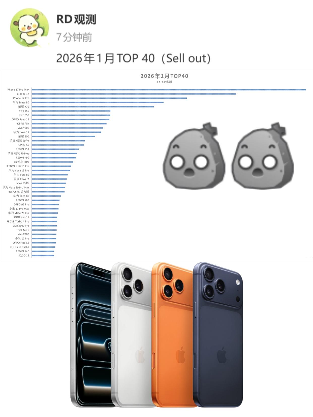 天塌了,已经没人管得了苹果了...... 你说夸不夸张,2026年第一个月,手机销量又又又被iPhone 17 Pro Max拿下了,还领先后面的一大截,而且第二是苹果17,第三是苹果17 Pro,苹果王朝了属于是 主要是苹果价格还高啊,Pro Max都得上万了,买苹果手机的有钱人是真多啊,后面的安卓性价比机型都赶不上,你说这是为啥呢?