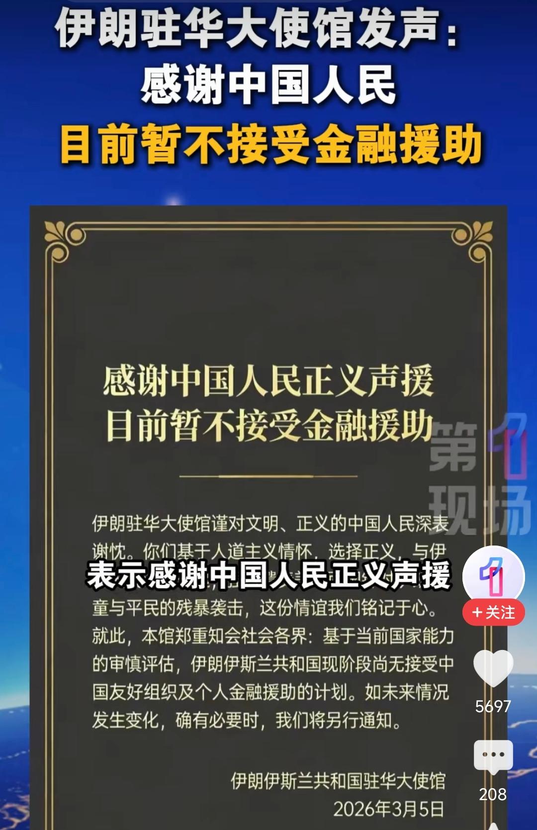 伊朗驻华大使馆发文表示:感谢中国人民的正义声援,目前暂不接受金融援助。 文中称:对文明、正义的中国人民深表谢忱。你们基于人道主义情怀选择正义,与伊朗人民站在一起,强烈谴责美以两国针对伊朗儿童与平民的袭击,这份情谊我们铭记于心。 就此,本馆郑重知会社会各界,基于当前国家的审慎评估,伊朗现阶段尚无接受中国友好组织及个人金融援助的计划。如未来情况发生变化,真有必要时,我们将另行通知。 从文中来看,“暂不接受金融援助”是重点。这说明伊朗对当前局势尚有应对的能力,整体韧性较为突出。在长期承受外部制裁的背景下,伊朗大概率是形成了相对完善的应对体系。 而官方表态现阶段可应对,也体现出了对自身社会运转、物资保障等方面的信心。所以,不到必要时刻,更愿意自行处理当前危机,坚守自身立场。 此外,婉拒援助也有务实考量:避免民间跨境资金往来被西方舆论歪曲炒作,减少不必要的外部干扰,既不给友好方增添舆论负担,也掌握处理危机的主动权。 但不管怎么说,这场双向奔赴里,中国民众给出了道义声援的温暖,伊朗也展现出自立自强的硬气。未来局势会如何生变咱不知道,但至少现在看来,伊朗仍有能力应对当下的局面。