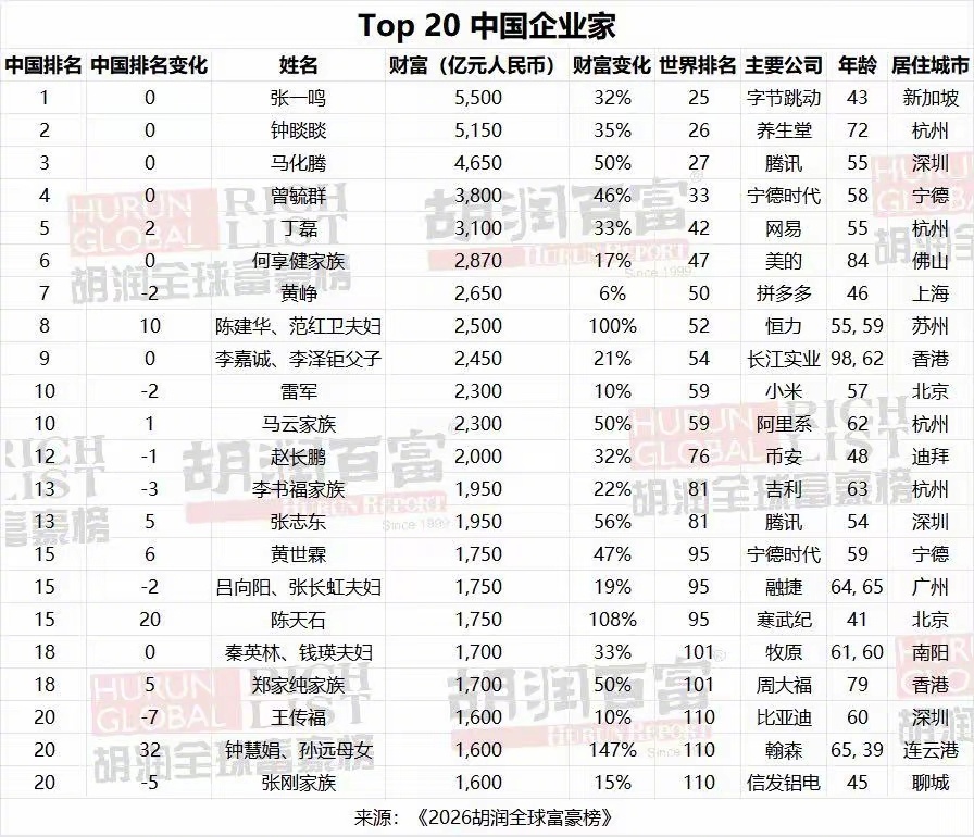 2026胡润全球富豪榜发布,马斯克以55400亿人民币成为世界首富,张一鸣以55