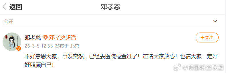 邓孝慈报平安邓孝慈发文报平安 3月5日,邓孝慈因突发身体不适,遗憾缺席今日活动,工作室第一时间说明情况并致歉。随后本人发微博报平安,称已完成检查、身体无大碍,同时暖心叮嘱粉丝也要照顾好自己。注意身体呀,大家都要健健康康的!