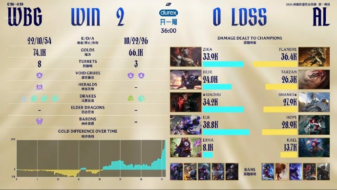 恭喜WBG 2-0 AL,如果AL再输一局将失去全球先锋赛的资格,赛前都以为AL打WBG会是3-0或者3-1,今天WBG全员发挥都太好了。大家觉得AL能否完成让二追三呢?wbg对战al 2026lpl第一赛段 英雄联盟