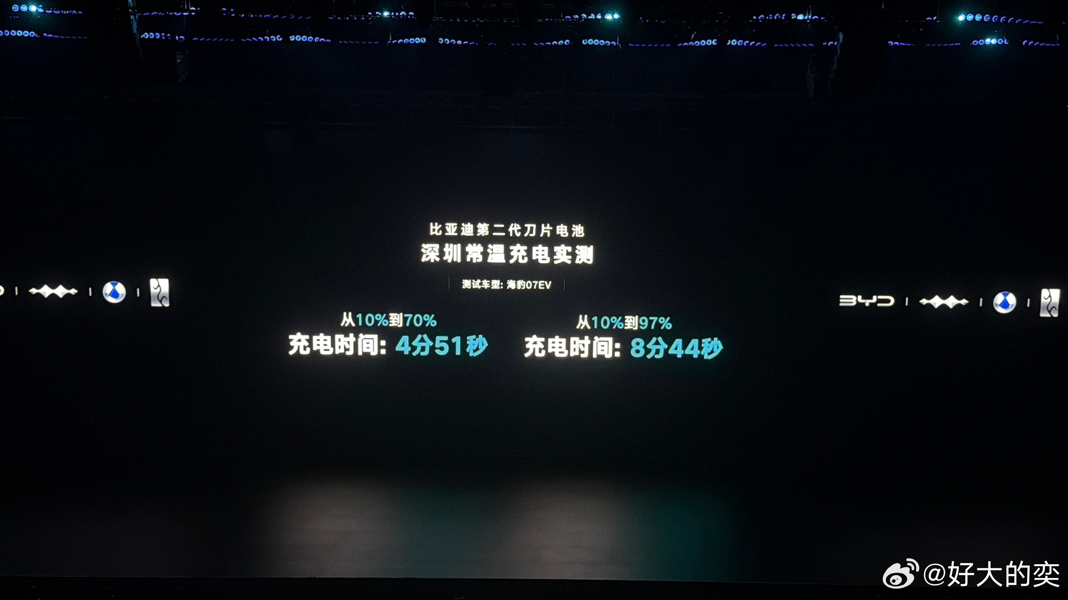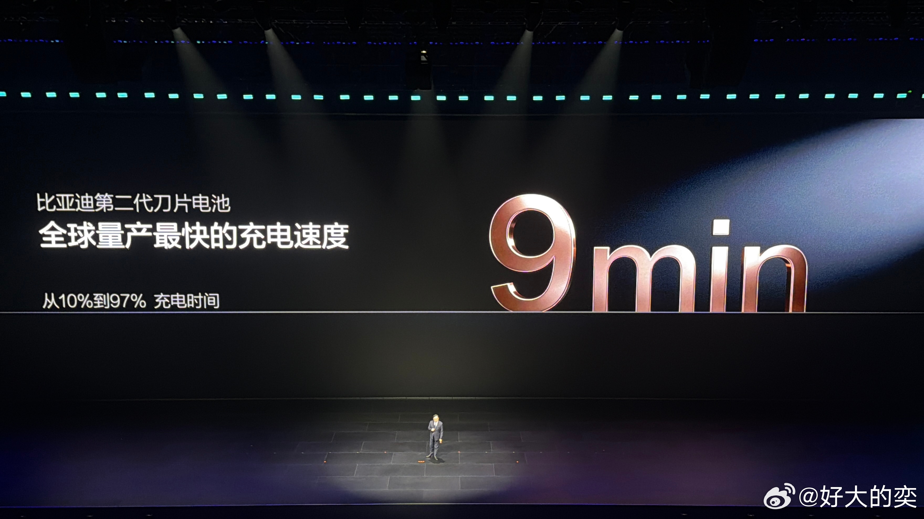 比亚迪第二代刀片电池发布,从10%充到70%,用时5分钟。从10%到97%,用时9分钟。