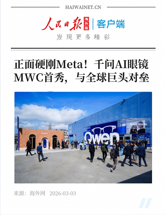 过去很多年,中国科技企业有个习惯。有技术,但比较低调。 但现在明显不一样了。在MWC 2026巴塞罗那展会上,千问AI眼镜直接把展台摆在了Meta AI眼镜对面,而且还竖起了一块5米高的“Qwen”巨型标识。 很多观众远远就能看到,这种摆法,其实很少见,因为在国际科技展会上,大多数厂商都会避开巨头。 但这次千问没有,原因其实很简单:产品真的能打。 首先是AI交互,很多体验者试戴后发现,千问AI眼镜AI响应速度非常快,千问唤醒速度比行业平均快约50%,基本做到开口就回应。 其次是续航,千问AI眼镜采用可换电设计,这意味着用户可以随时更换电池,实现全天候使用,对于AI设备来说,这是非常重要的一点,拍照方面还加入超级夜景。 不少海外博主体验后评价:Meta更像相机,而千问更像AI设备。 更关键的是生态,千问AI眼镜已经全面接入千问APP,未来可以一句话完成点外卖、订酒店、打车等操作,也就是说,它不仅是眼镜,更是一个戴在脸上的AI助手。 千问AI眼镜G1将在3月8日中国市场现货发售,1997元起。 如果说过去几十年是欧美科技进入中国市场,那么现在,中国科技正在走向世界