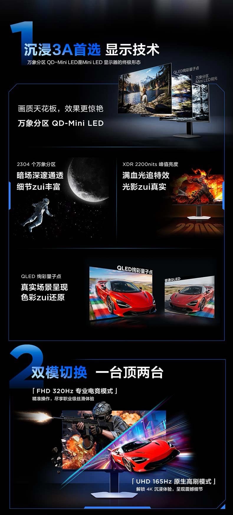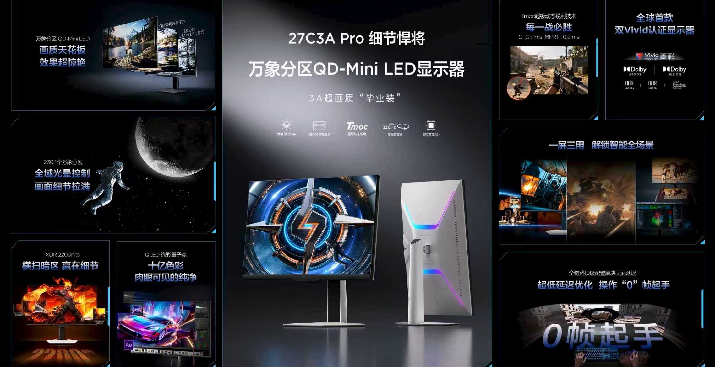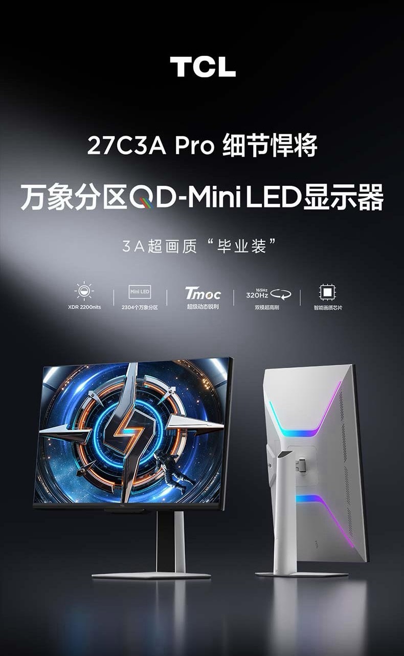 2️⃣ 27C3A Pro「细节悍将」:3A游戏党福利,27英寸万象分区QD-Mini LED,2304个控光分区,XDR 2200尼特峰值亮度,QLED量子点+HDR双Vivid认证,支持4K 165Hz / 1080P 320Hz双模切换,甚至可当电视使用,售价3199元。