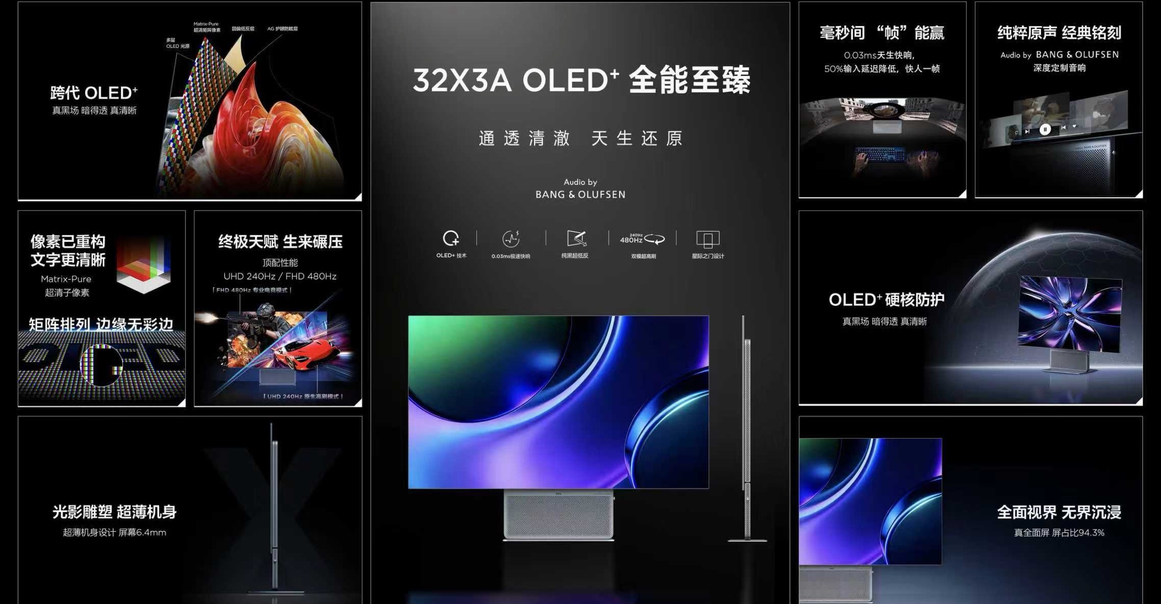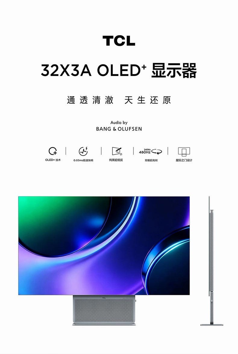1️⃣ 32X3A OLED+「全能至臻」:创作者首选,31.5英寸多层OLED纯净光源,6.4mm超薄机身,4K 240Hz / FHD 480Hz双频高刷,0.03ms灰阶,99% DCI-P3广色域,背部氛围灯+ B&O音响加持,售价5999元。