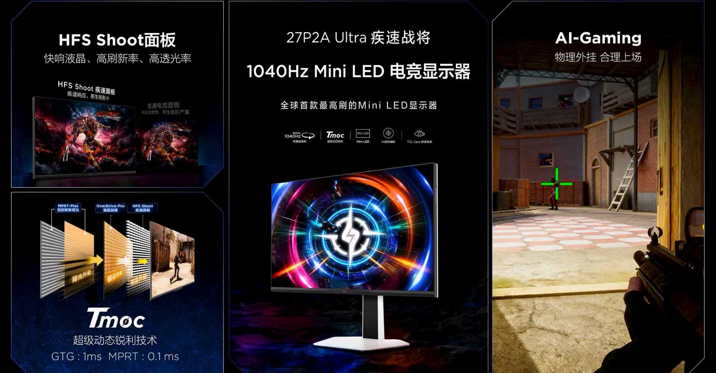 3️⃣ 27P2A Ultra「疾速战将」:极致电竞玩家专属,全球首款1040Hz Mini LED电竞显示器,采用华星HFS Shoot面板与Tmoc超级动态锐利显示技术,GTG延迟低至1ms,支持超频至1040Hz,还搭载AI电竞辅助功能,价格暂未公布。