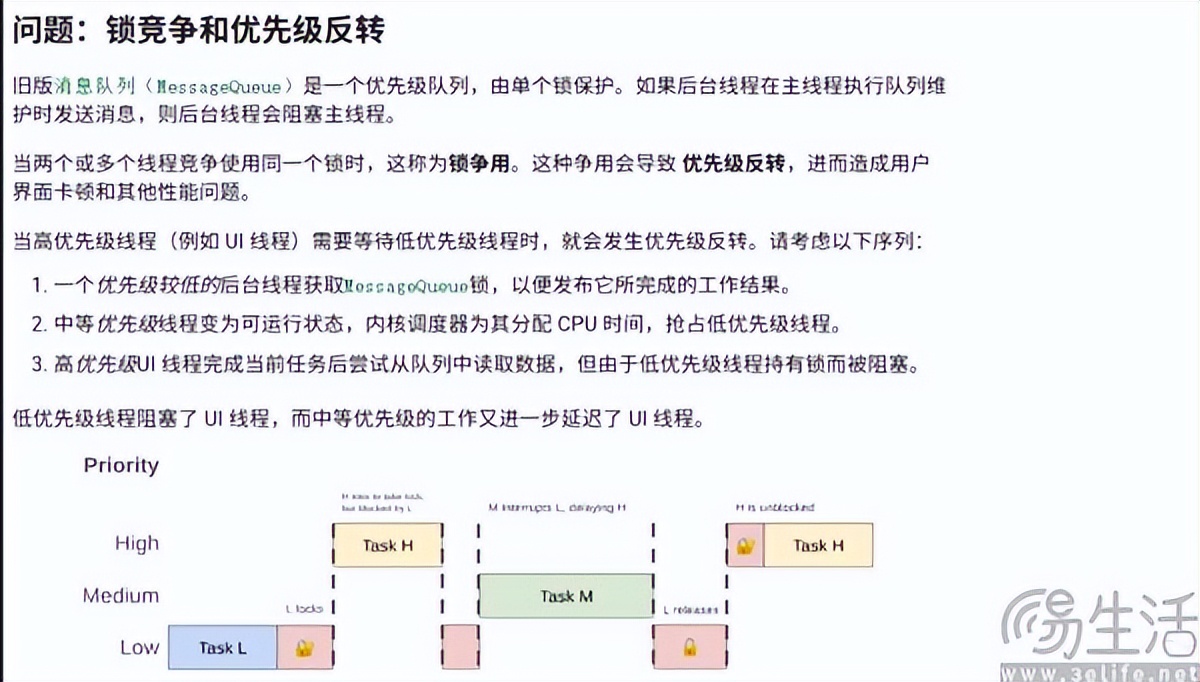 MessageQueue在Android系统中被设计为一个无限循环的队列,会持续轮询消息,当有新的消息时就去处理,否则就等待。可问题在于,MessageQueue处理消息时必须遵循严格的单线程锁定顺序、来排队访问内存,所有工作线程必须按顺序等待内存锁释放才能执行任务。