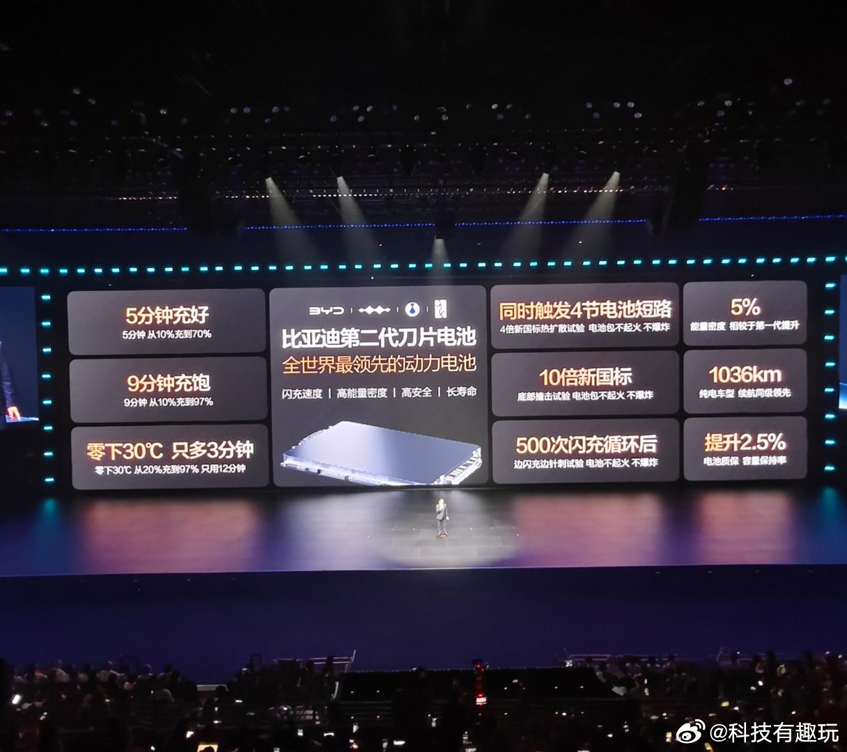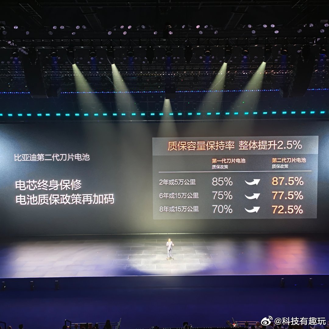 搭载比亚迪第二代刀片电池的车型,像腾势Z9GT直接做到了:1036公里,成为全球最长续航的纯电车型,其他车的续航,也做到了同级领先!比亚迪还对第二代刀片电池质保政策进行加码,只要电池容量低于 77.5%,比亚迪就免费包换,同时电芯终身保修!最最最香的就是给所有第二代刀片电池的用户免费赠送1年充电权益比亚迪今晚发布二代刀片及闪充比亚迪第二代刀片电池