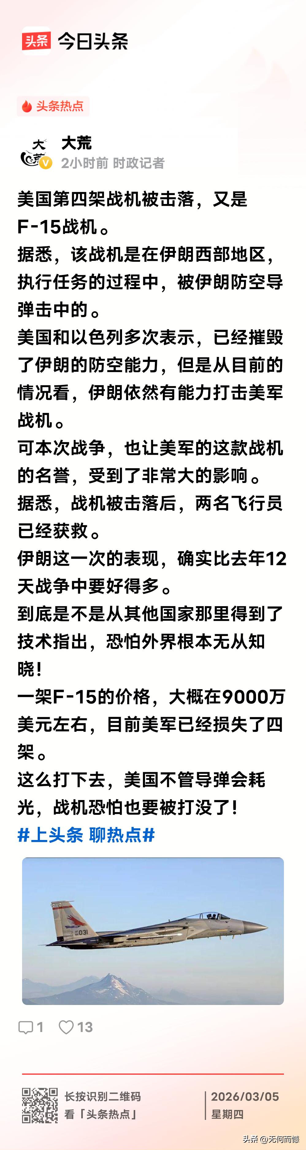 美国f15战机又被击落一架,这次不是被友军误伤,是被伊朗给打下来的,据说这种飞机一台造价达到9000万美元,到目前为止已经被打落了四架,如果照这种速度发展下去的话,美国的损失可就大了,正如老话所说,那样偷鸡不成,反蚀一把米,现在美国就开始品尝这样的恶果了!