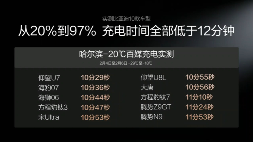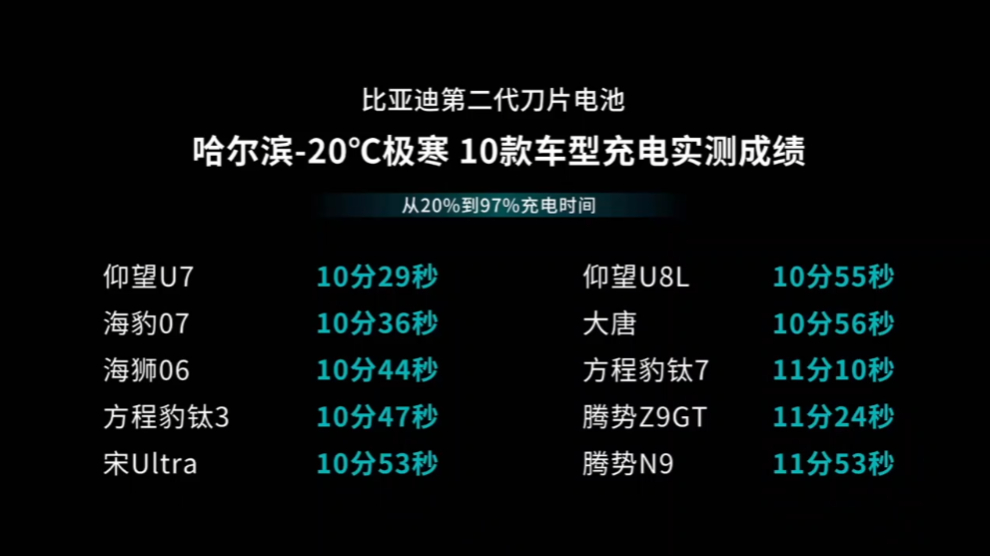 但这今天迪子的「颠覆性技术」真的是要把这句话颠覆了。第二代刀片电池,直接把技能点点满了:在零下30度这种极寒环境,车子完全冻透的情况下,竟然只要12分钟就能充满电。这不仅仅是快,更是是“快到离谱”现在很多电车在大夏天常温下快充还得半小时呢,现在冰天雪地里中还能充到更快几倍。这哪是技术升级啊,简直是给电动车在北方市场发了一张“通行证”