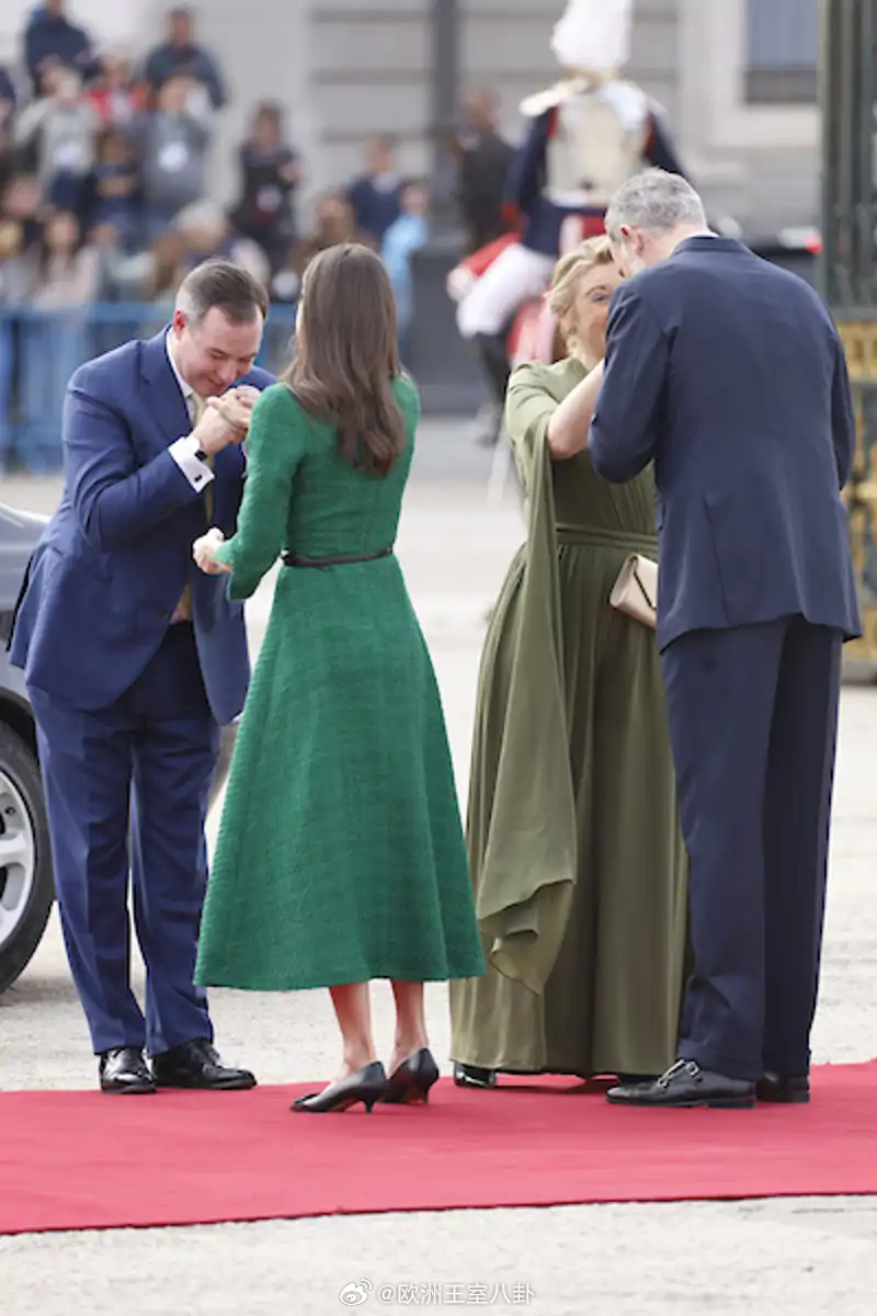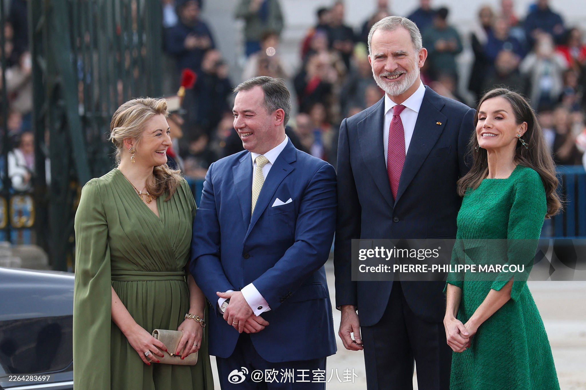 3.5 卢森堡大公纪尧姆五世和大公夫人斯蒂芬妮访问西班牙,才碰头排排站不久速报下。斯蒂芬妮连体裤来自elie saab,她竟然这都戴了半套黄水晶