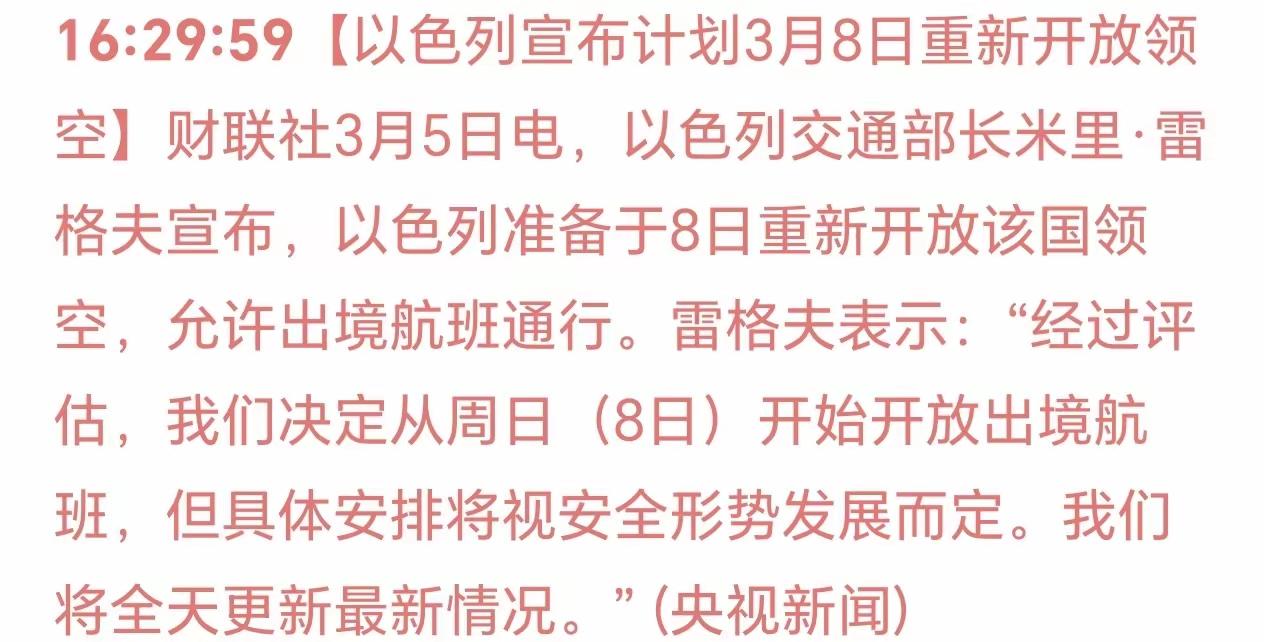 以色列已正式宣布,计划于3月8日重新开放本国领空、恢复出境航班,相关安排将视安全形势动态调整。从以色列的立场来看,这一动作释放了明确的停火信号,相当于对外宣告己方无意再对伊朗发起新的军事行动。一旦以色列如期兑现承诺,若伊朗后续仍采取军事打击行动,道义与舆论的主动权将完全转移至以色列一方,伊朗则会陷入“破坏和平进程”的被动境地。 与此同时,中国政府中东问题特使已启程访问中东,全力推动地区紧张局势降温。此前中方已密集开展外交斡旋,王毅外长先后同伊朗、以色列、沙特等中东多方外长通电话,就止战促和交换意见、凝聚共识。凭借中国在国际社会、尤其是中东地区长期秉持的公正立场和持续提升的影响力,冲突各方大概率会给予积极回应,为双方对话谈判创造关键外部条件。 本轮冲突中,伊朗虽遭美以突袭蒙受不小损失,但也通过报复性反击给美以造成显著杀伤,打出了对等威慑力。这种“有来有回”的攻防态势,让伊朗摆脱了此前的被动局面,拿到了后续可以上桌谈判的有利筹码。 复盘此次中东冲突,美以虽凭借军事优势一开始占据主动,但持续对抗以后,随着伊朗开始导弹反击,以色列也明显感受到了切实的安全压力,美国更不愿看到冲突进一步升级、局势彻底失控,因为陷入持续消耗又打不赢战争,美国也面临国内外舆论和政治压力。对伊朗而言,持久战虽有战略层面的合理性,但长期对抗必然带来持续国力消耗,更会滋生诸多不可控的地缘风险。持续升级的冲突最终只会走向两败俱伤,没有真正的赢家。因此,通过对话谈判化解分歧、实现止战降温,对美以伊各方而言,都是当下最理性、最符合自身核心利益的选择。