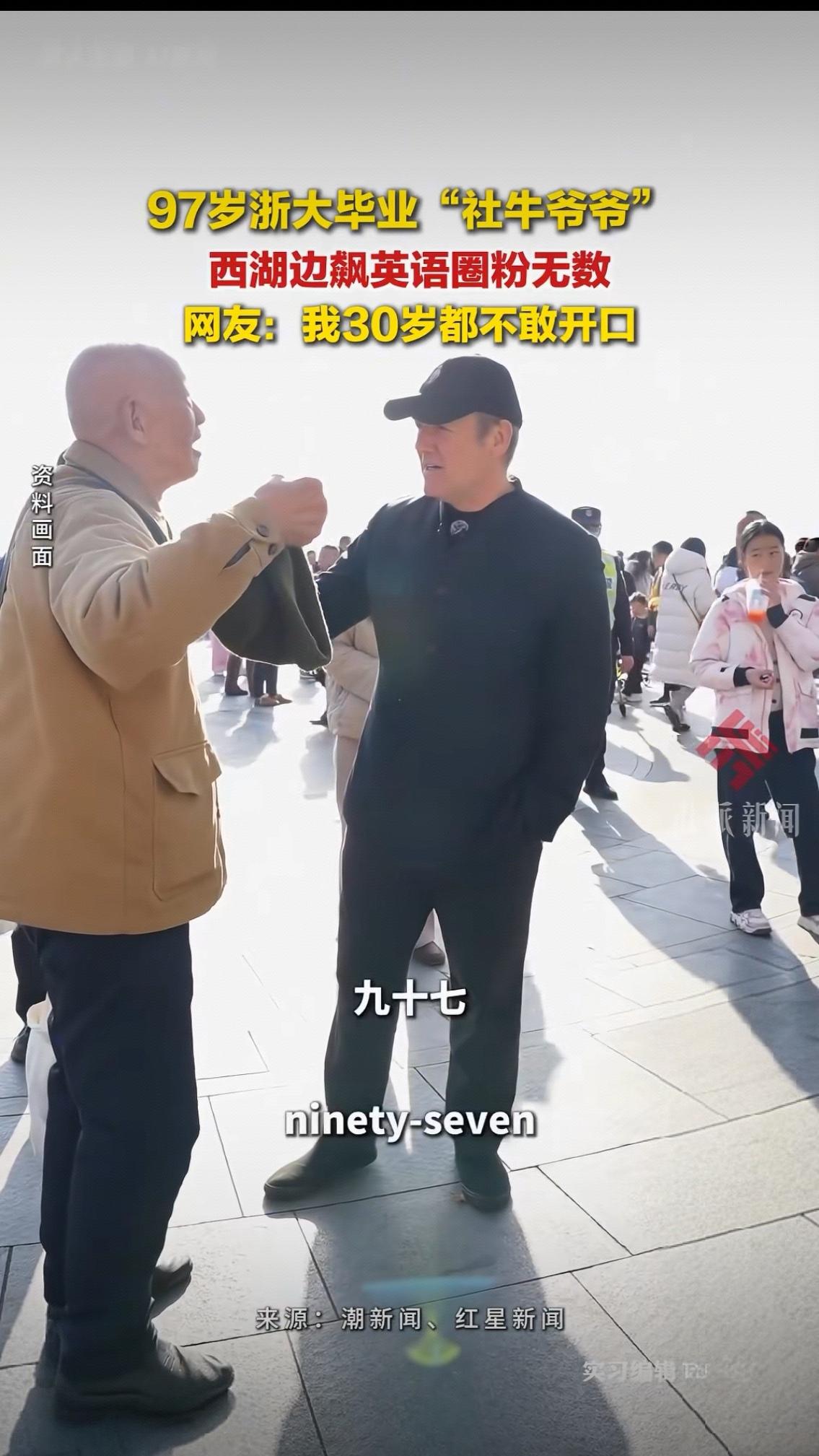 97岁浙大毕业"社牛爷爷"西湖边飙英语圈粉无数 网友:我30岁都不敢开口 杭州西湖边,一段视频刷爆全网,一位头发花白的老人,对着外国博主流利飙英语,谈吐从容、眼神自信,当他笑着说出自己97岁时,对面的老外直接抱拳惊呼“佩服”,无数网友看完瞬间破防。 这位爷爷名叫周盘麟,是实打实的浙大高材生,年轻时深耕学业,退休后也从未停下脚步。别人的晚年是养花遛鸟、安享清闲,他却每天雷打不动出现在西湖边,主动找外国友人交流,把湖畔变成了自己的“英语角”。没有怯场,没有拘谨,即便年近百岁,依旧敢开口、爱表达,浑身上下都透着藏不住的精气神。 评论区里,满是年轻人的惭愧与感慨。多少人二三十岁,捧着英语证书却不敢开口说一句,总怕发音不标准、怕被人笑话,把自卑裹在身上,连尝试的勇气都没有。而这位97岁的老人,用行动告诉我们,年龄从不是阻碍,胆怯才是。他学英语不为名利,只为让大脑保持活跃,只为在交流里感受生活的热情,这份通透与热爱,远比流利的口语更打动人。 我们总在抱怨生活无趣、年纪大了学不动,却忘了真正的衰老,是从放弃自我开始。周爷爷的火,从来不是因为英语有多好,而是他活成了所有人向往的样子:不被年龄定义,不被世俗束缚,永远热烈,永远勇敢。 这才是最该追的星,没有华丽的包装,只有岁月沉淀的从容,和刻在骨子里的终身热爱。看完你还敢说自己来不及吗?社牛 杭州老爷爷
