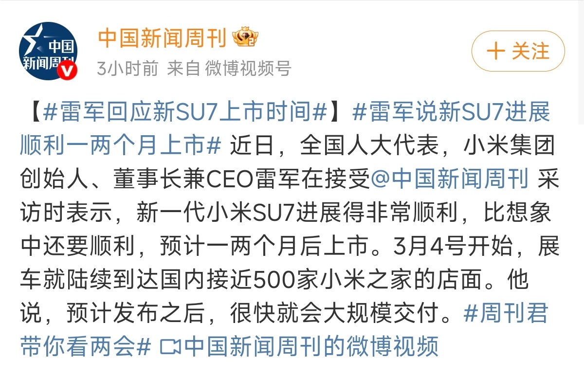 雷军说新SU7进展顺利一两个月上市注意雷军接受采访时的话:“预计发布之后,很快就会大规模交付”注意,大规模交付,而不是YU7上市时的“预计八月初开启交付”
