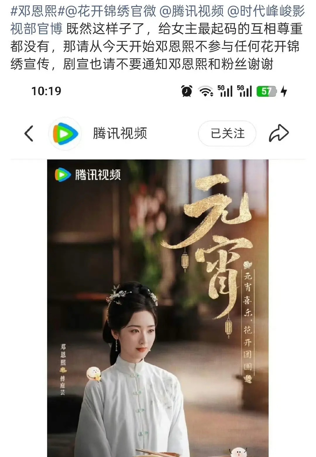 邓恩熙粉丝要求花开锦绣道歉,元宵物料词条带的是宋祖儿