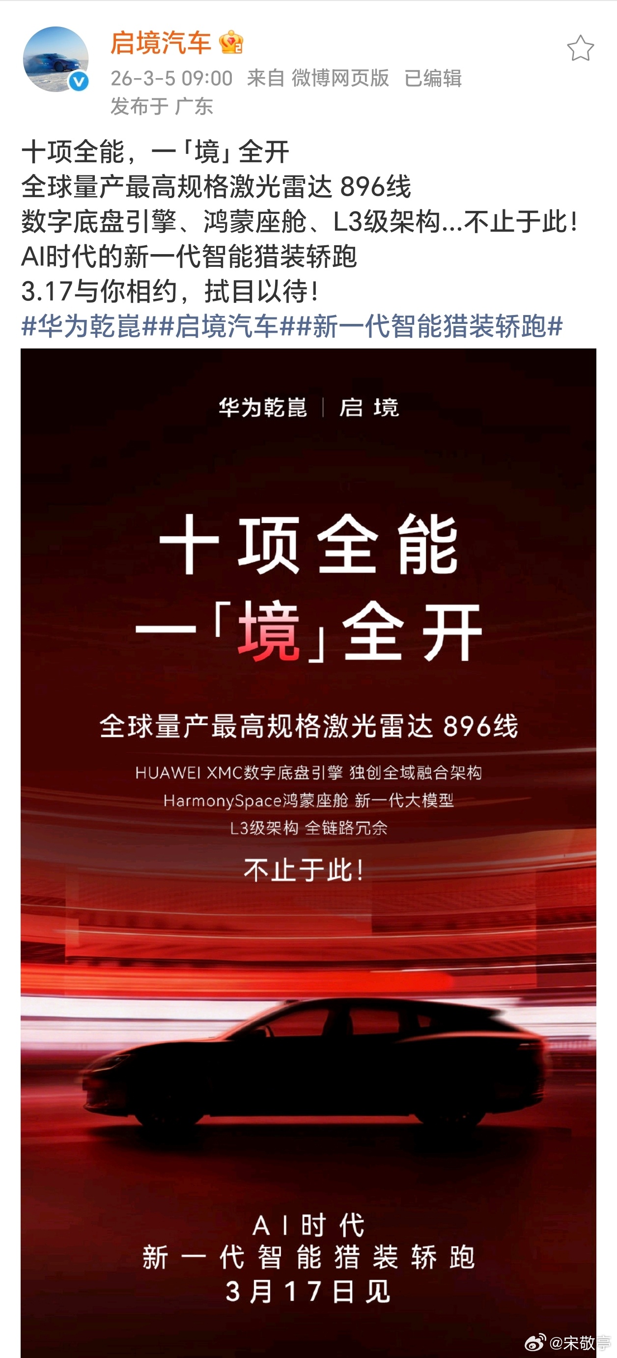 华系首款猎装轿跑启境即将亮相启境首款猎装轿跑或命名7系列昨日的鸿蒙智行发布会上尊界 S800 以全球量产最高规格激光雷达896线震撼全场,启境今日就官宣同源技术下放,让华系首款猎装轿跑在核心技术领域也能实现全域领先!更加期待3月17日的亮相。