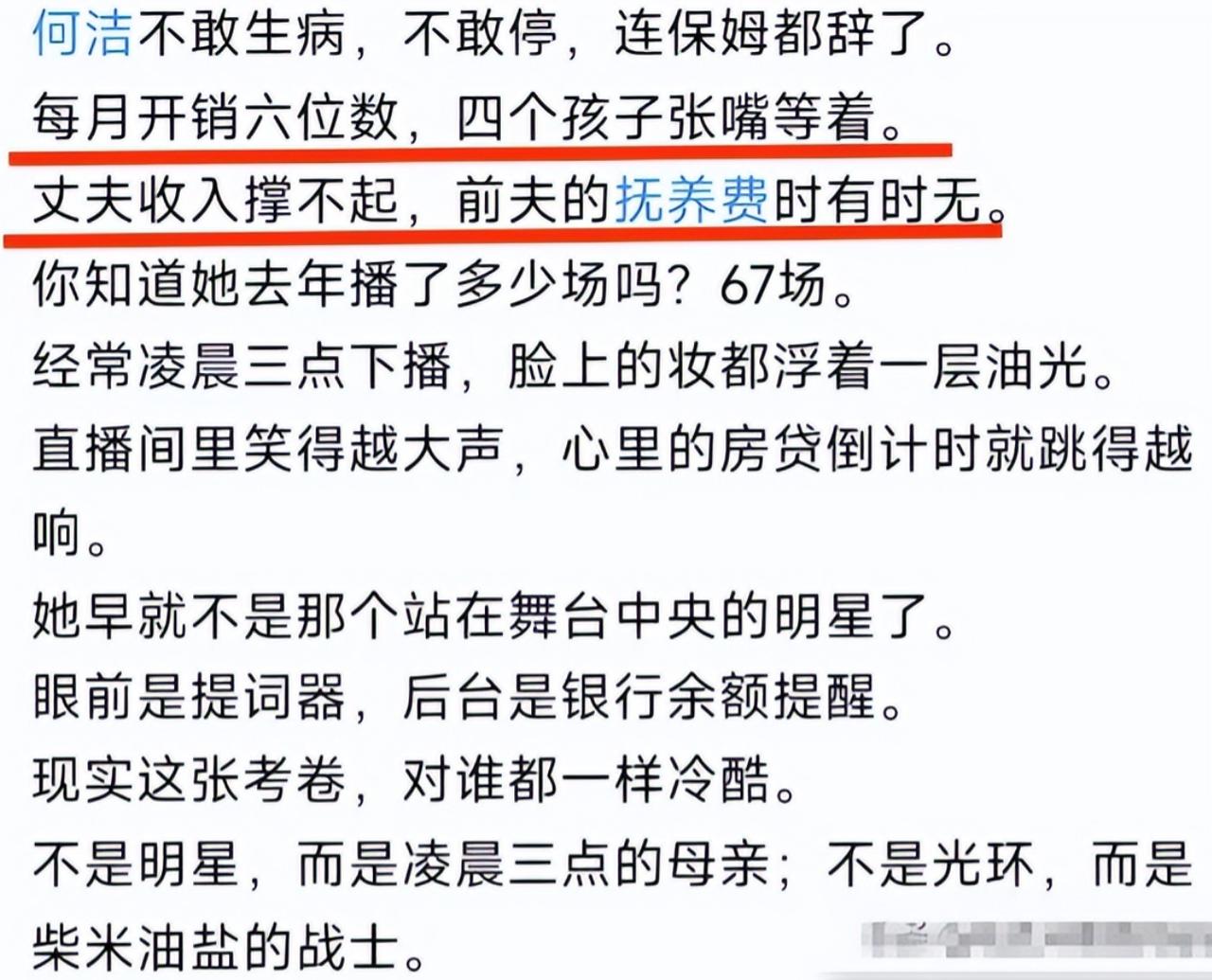 “女人最大的自律就是管好自己的肚子,别乱生孩子”,这句话的含金量还在上升。 看何洁在直播间哭诉养孩子太累,突然想到了这句话。 在快女中,何洁算是发展得较好的,但发展得再好,也避免不了被家庭孩子拖累。 何洁一共经历了两段婚姻,和前夫赫子铭有2个孩子,离婚后两个孩子归她,与刁磊结婚后,何洁又生了一个孩子,再加上刁磊前段婚姻中的一个孩子,这个家庭一共有4个孩子。 两个大人四个孩子,每个六位数的开销,压力全在何洁身上,前夫赫子铭多年来了一分钱抚养费不给,每天睁眼就是账单,压力大到失眠,很多事情只能自己来,而且还要拼命接通告养活全家,整个人看起来苍老了很多。 再看同样是快女的李宇春,尚雯婕,包括张倩颖,哪一个不比她轻松。 本来在与赫子铭的婚姻中,何洁已经见识到了男人的不负责,还曾在网络上吐槽对方一边打游戏一边带孩子,两个孩子全靠她带,可再次走进婚姻后,何洁还是忍不住又生了一个,真不知道是遇到了真爱,还是生孩子有瘾,现在压力大出来哭诉,又何尝不是自己选择的一种生活。