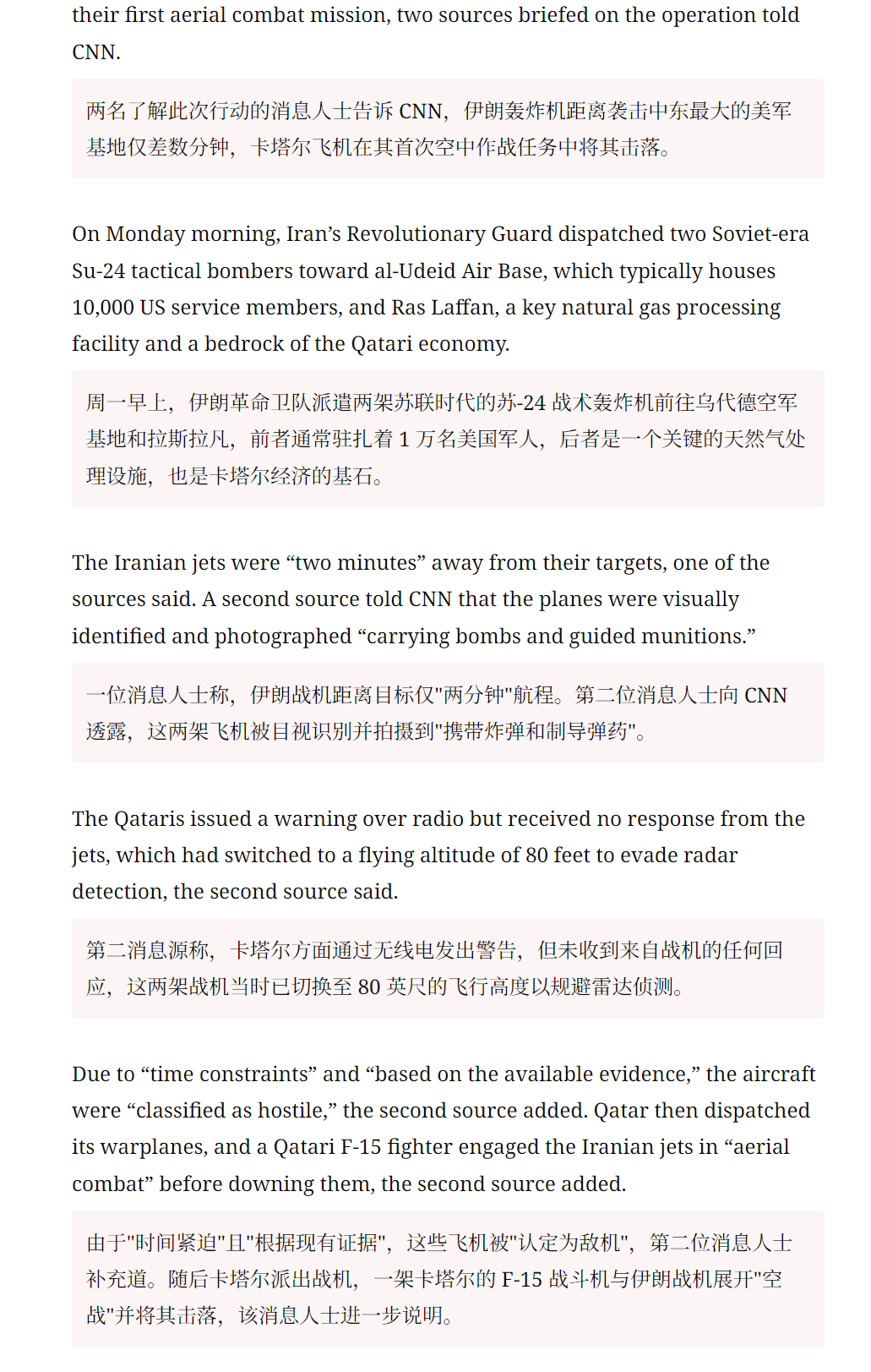 🔻CNN:决死冲锋的伊朗苏-24战斗轰炸机,被卡塔尔击落前距离中东最大的美军基地乌代德空军基地只剩两分钟距离。🔻面对卡塔尔通过无线电发出的警告,战机没有给出任何回应,而是下降到 80 英尺的飞行高度以规避雷达侦测(24.384米)。🔻飞机被击落在海面,飞行员没有搜救到。伊朗称成功突破以色列七层防御伊朗报复美以海外新鲜事中东现场直击