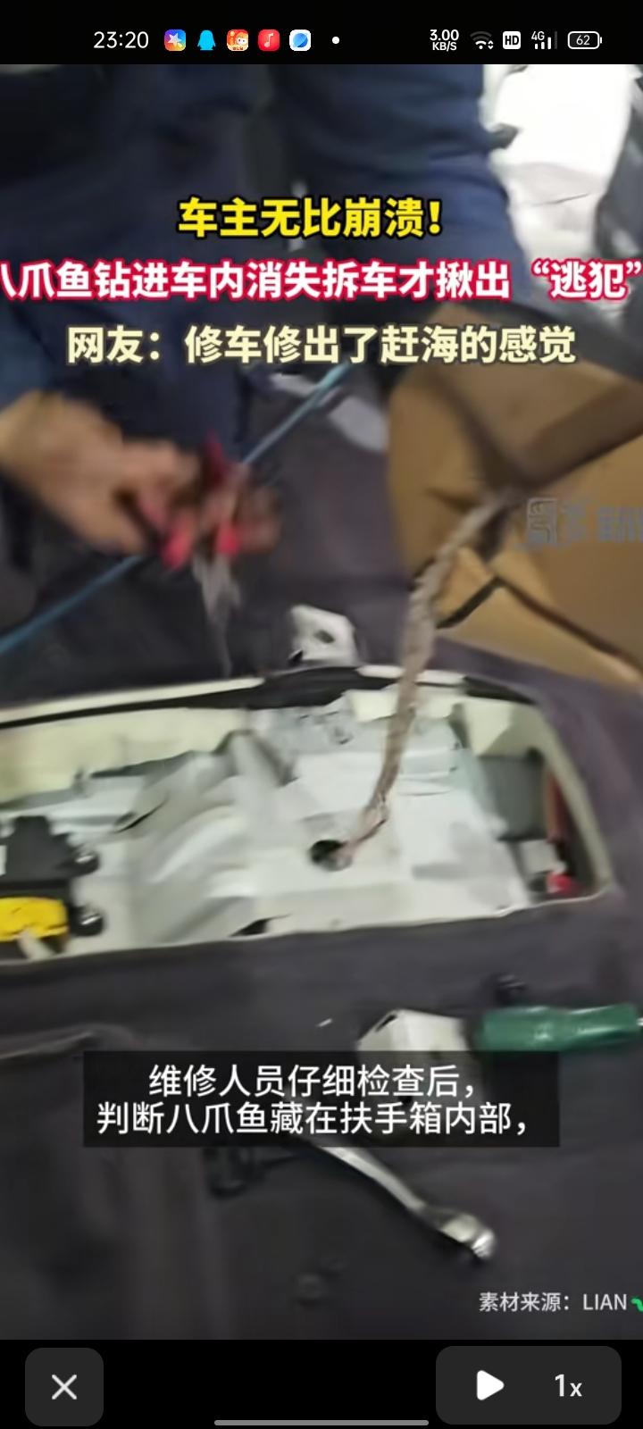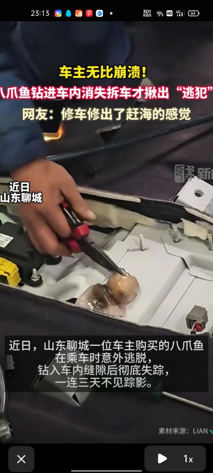 3月4日,山东聊城。女子分享一段视频,自己去菜市场买八爪鱼,准备做辣炒八爪鱼吃吃,开膛破肚后就没有系口,直接放在车上副驾驶,到家后直接扔进水池,后来发现少了一只,家里和车上都找遍了就是没找到。 这几天,车里逐渐散发出异味,担心异味扩散,又影响车辆部件,无奈之下只好去4S店求助。维修人员仔细检查后,判断八爪鱼藏在扶手箱内部,随即拆解部件,最终在扶手箱内找到了失踪多日的八爪鱼,就是维修人员被熏吐了