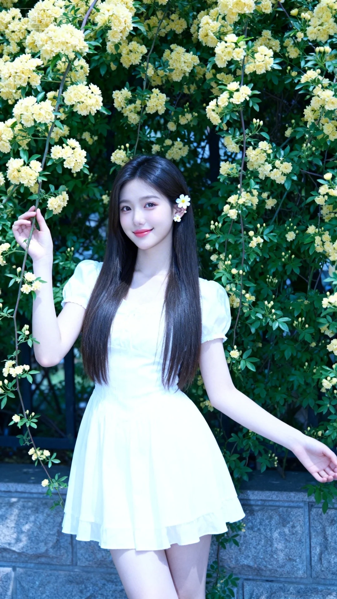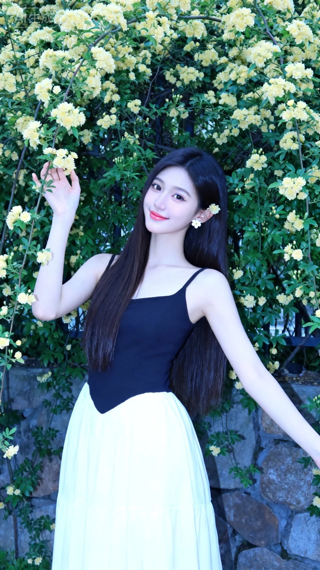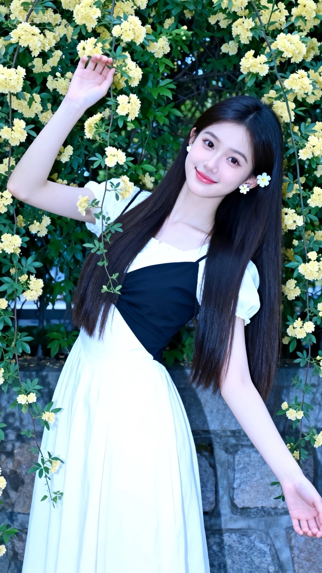冷色调,高曝光,高亮度,18岁女大学生,超级韩系美少女,三庭五眼比例均衡,长直发,,身材娇小,细腻陶瓷水嫩肌肤,偏冷白皮,妆容精致,上半身特写,正面照,全景镜头,人物上半身特写镜头,身穿墨白色长裙,连衣裙,最佳配色,最高等级画质,IHD,梦幻,美颜全开,超高清,32k分辨率,去掉一切噪点,写实的画面风格下,背景,佩戴小巧白色花朵耳钉,站立于繁花枝叶间,身体微向镜头倾斜,左臂抬起、手指轻触身旁黄色小花枝,右臂自然搭在身侧,头部轻侧看向镜头、嘴角带浅笑,背景满丛黄色小花+翠绿枝叶+石墙