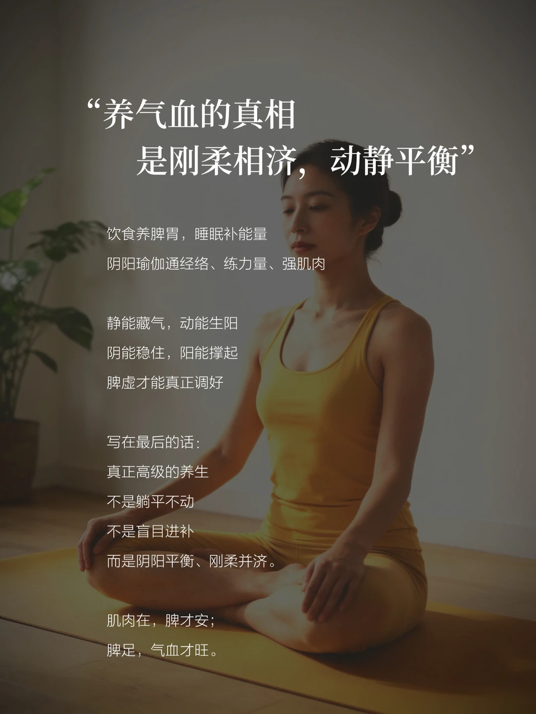 93年阴阳瑜伽教练|宝妈|专注气血调理 很多脾虚、产后虚的女生 都掉进一个大坑: 虚了→躺平→补→静养→更虚 越睡越累 越补越堵 越静越没力气 结合李辛老师《精神健康讲记》 我才真正懂: 纯阴无阳,身体就是一潭死水 脾主肌肉,无肌肉,脾永远补不起来 写在最后的话: 真正高级的养生 不是躺平不动 不是盲目进补 而是阴阳平衡、刚柔并济。 肌肉在,脾才安; 脾足,气血才旺。 你是不是也 越静越虚、越补越堵、越躺越没力气?