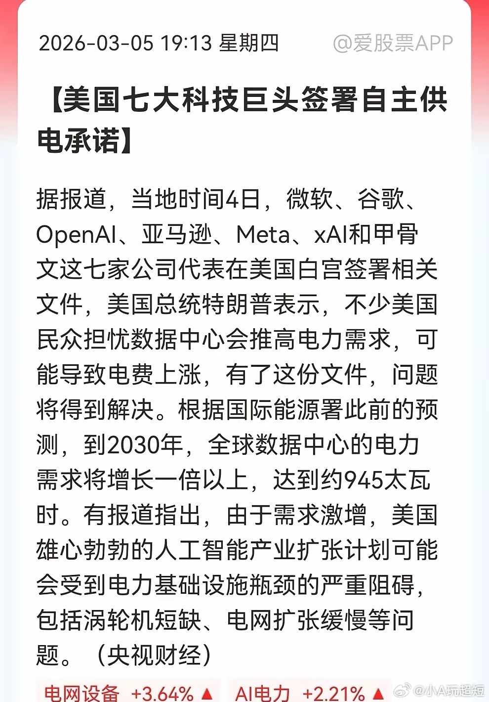 快讯!晚间,AI电力继续被利好催化,美国七大科技巨头已经签署自主供电承诺,这个板块要开启“突突”模式吗?据报道,美当地时间4日,微软、谷歌、OpenAI、亚马逊、Meta、xAI和甲骨文这七家公司代表在美国白宫签署相关自主供电文件。日前,AI把美国电网被逼到了墙角,不得不开始大修“电力高速公路”的消息已经催化AI电力大涨一波了,自假期以来我也一直推荐这个板块的消息,其确实走势也不错。今晚美股科技七巨头签署自主供电,令这个板块的确定性更进一步,这个无疑是个重磅利好了。大国AI竞争说到底就是电力的竞争,随着AI发展,电力的需求上限还是看不到顶的,根本就到无法估算。特别是美国,作为AI第一大国,而其基础电力建设相对于另一AI大国差距是十分明显的,所以其大规模加快电力布局是必然的,现在把这个重任交回给科技巨头们,那么建设效率只会加快落地,对于我们的电力产业链来说无疑是大利好。最近大A相关板块,电网设备,电源,电缆已经表现得非常不错了,趋势向上已经很明显,明天会不会借助这个消息大爆发开始主升浪呢,是值得期待的。