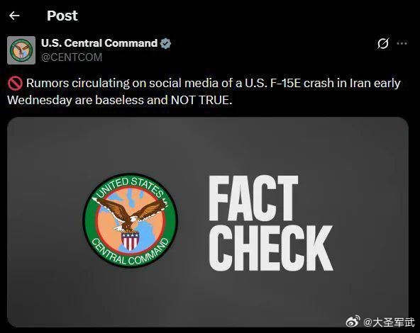 美国中央司令部:社交媒体上流传的美军F-15E战机于周三凌晨在伊朗坠毁的传言,毫无根据,纯属造谣。 美以伊最新局势伊朗以色列宣布袭击伊朗