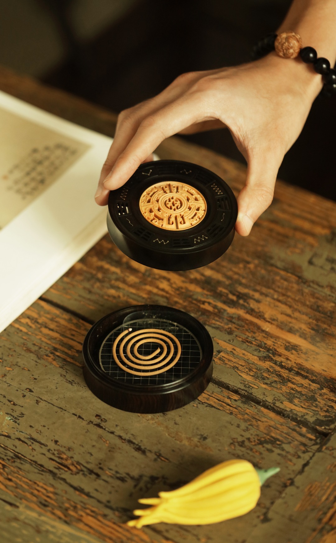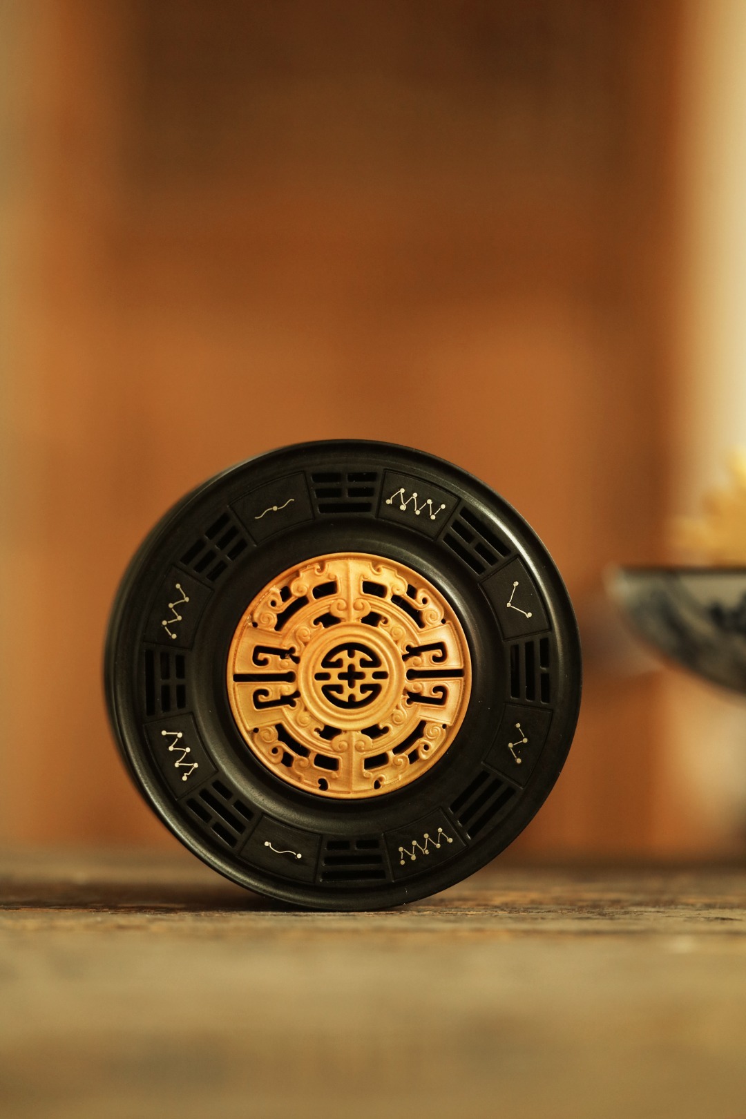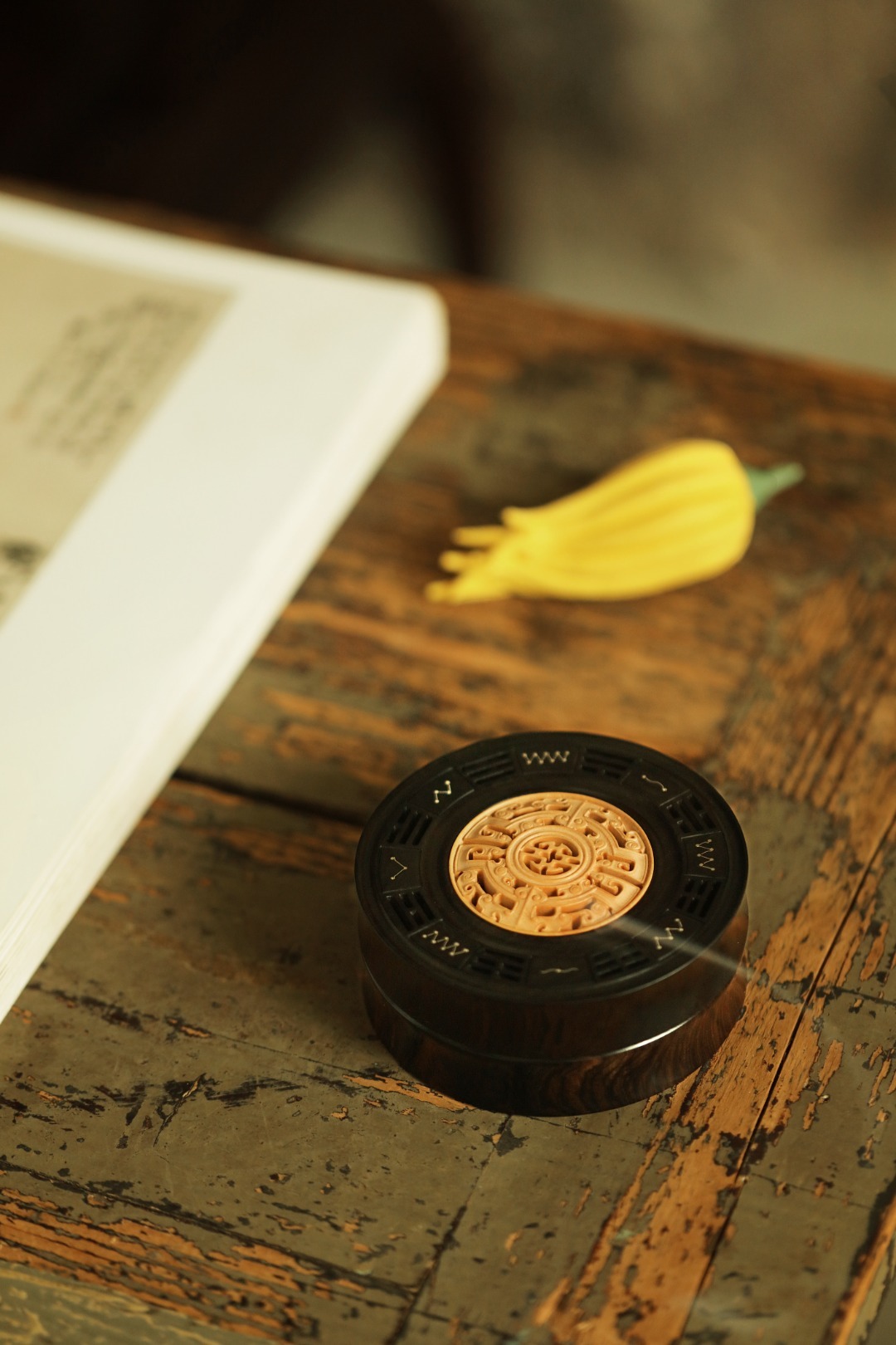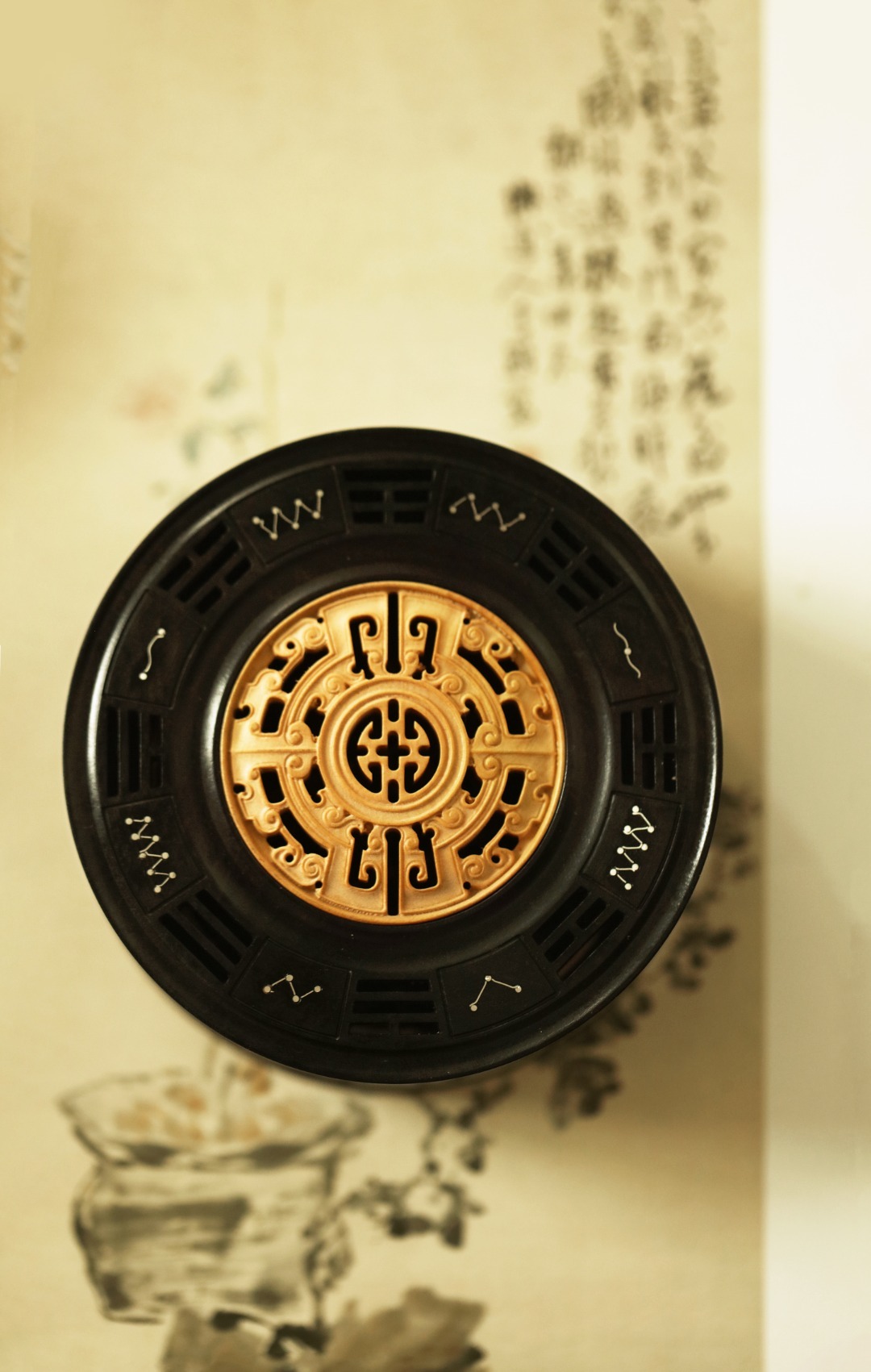 紫光檀制器,竹节式,盒盖黄杨木透雕雷云纹,银丝镶嵌北斗七星,寓意祥瑞。陈置案几燃香,文雅精致!
