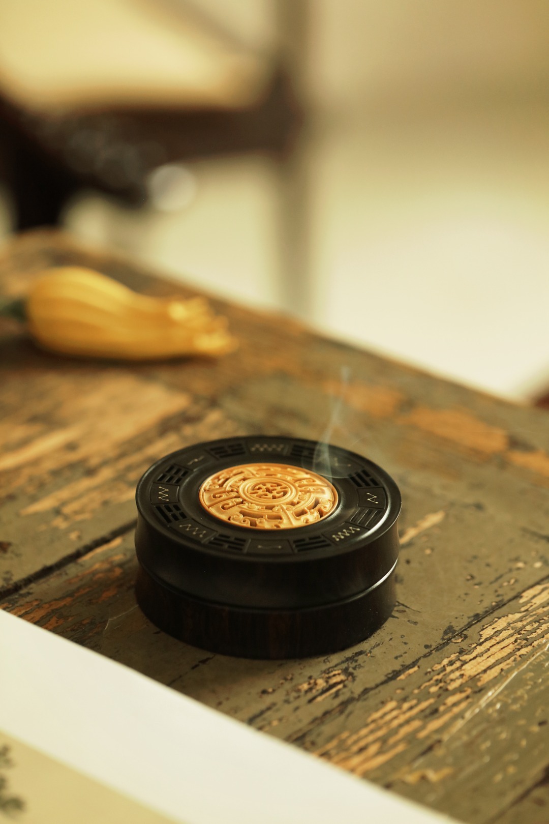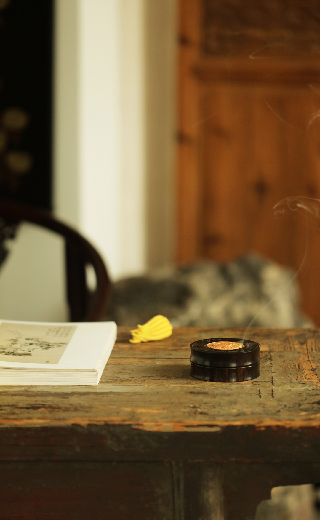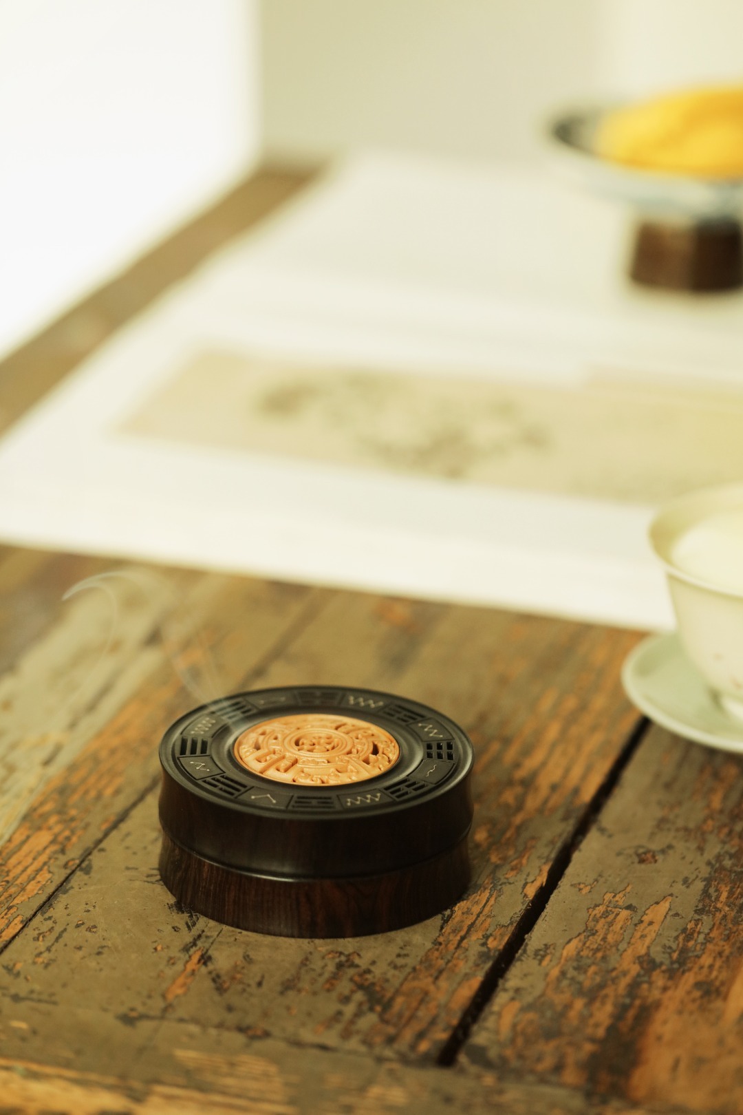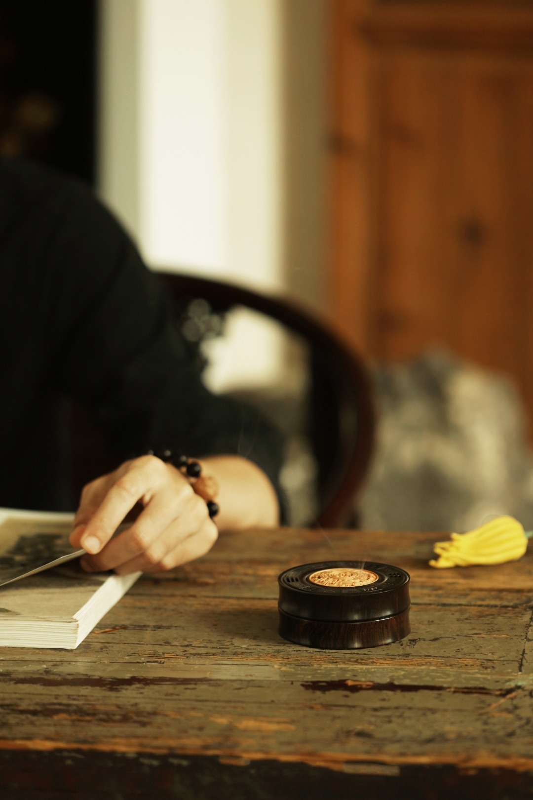 紫光檀制器,竹节式,盒盖黄杨木透雕雷云纹,银丝镶嵌北斗七星,寓意祥瑞。陈置案几燃香,文雅精致!