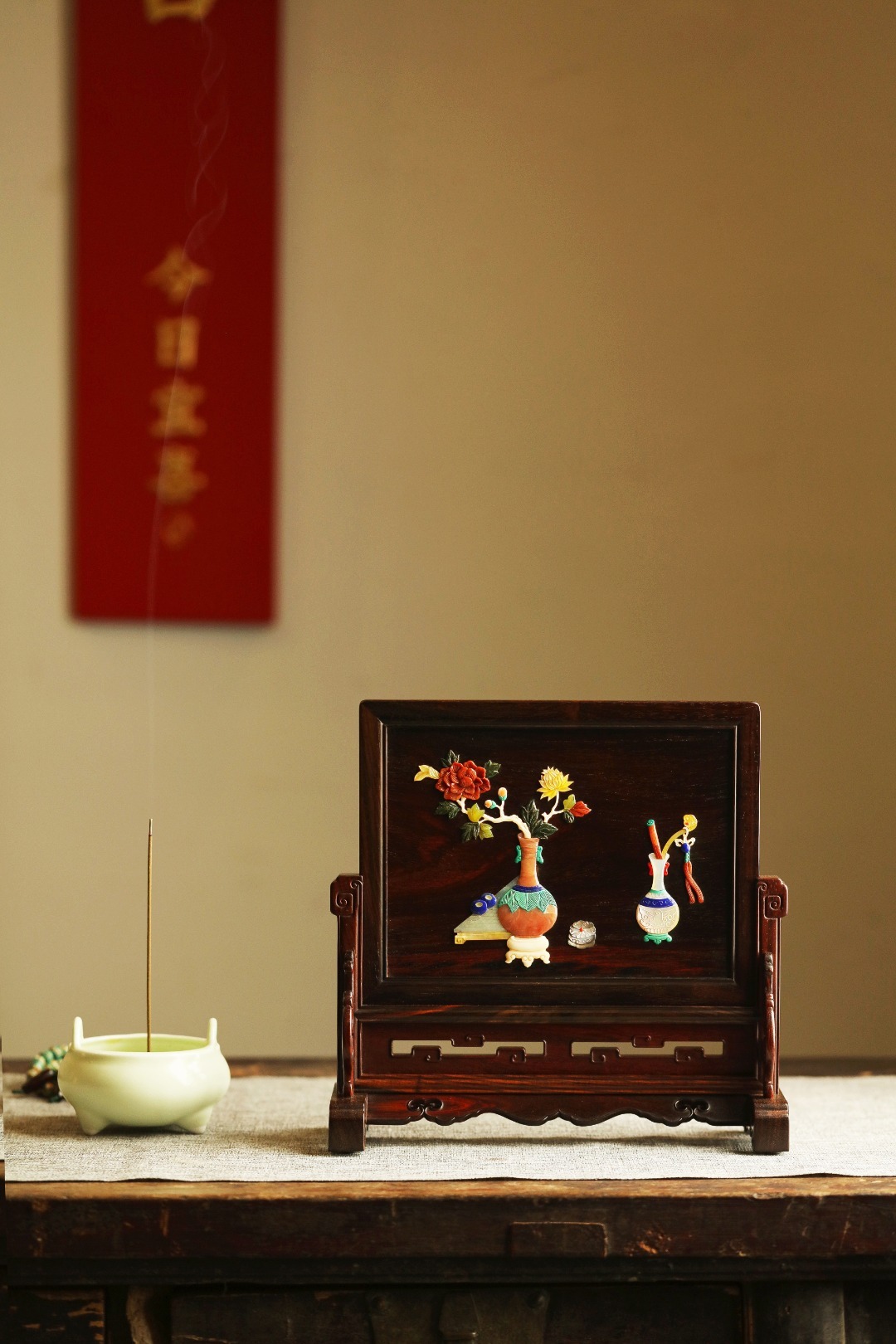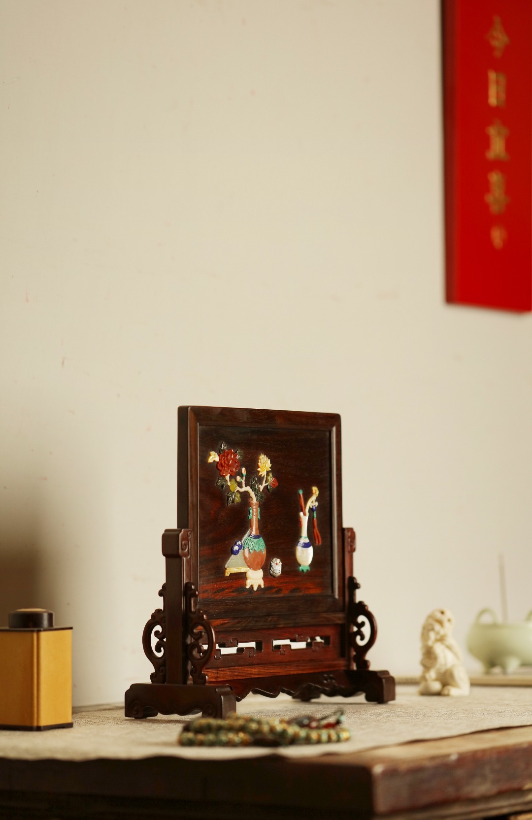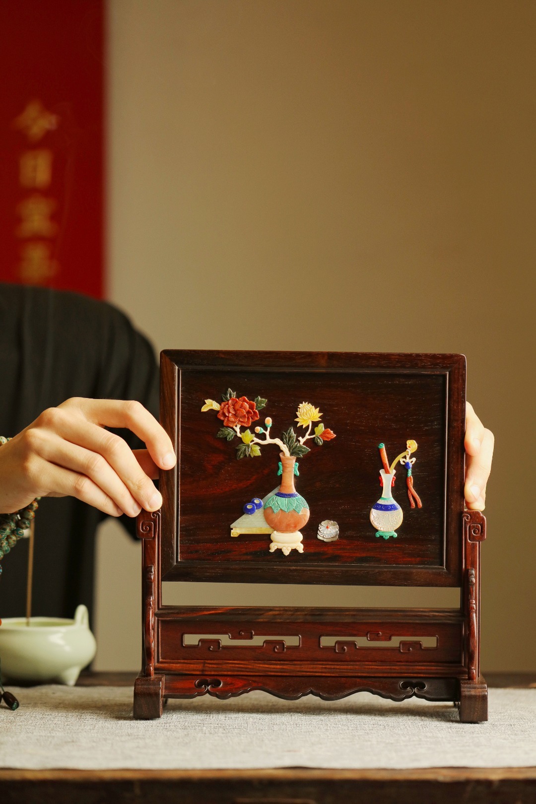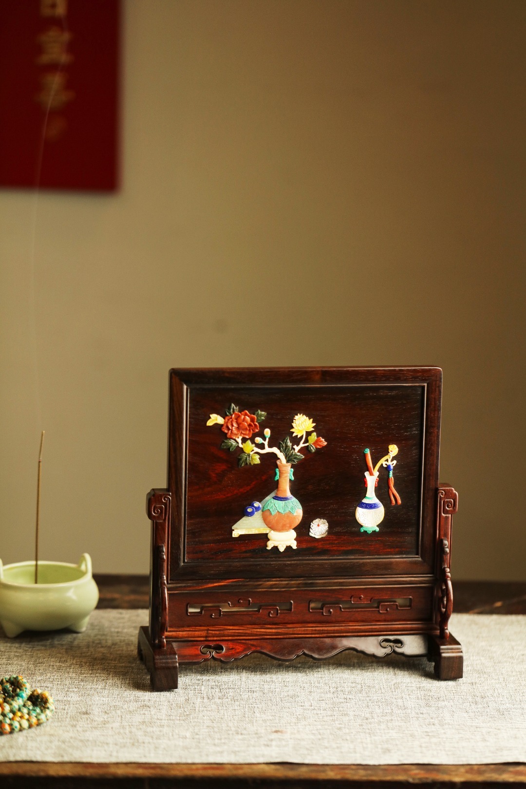 酸枝镶嵌百宝嵌博古图,端庄古雅,寓意祥瑞;置案清赏,添祥和雅意。