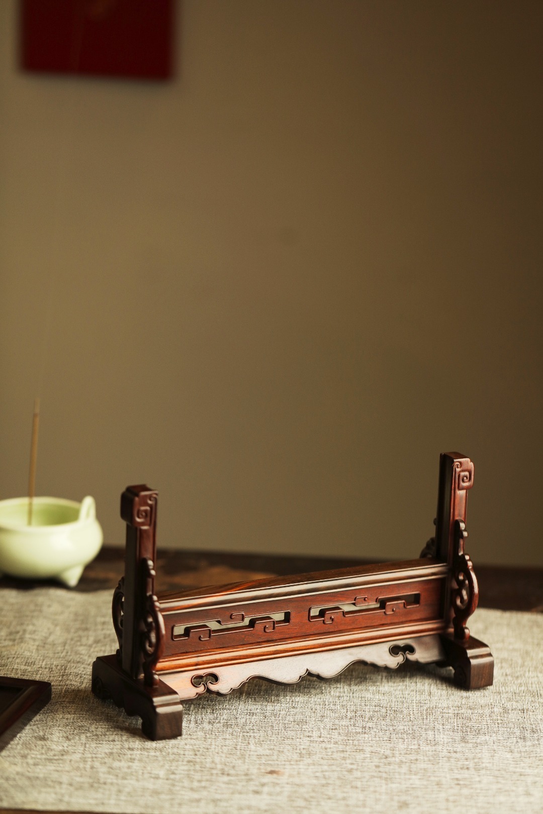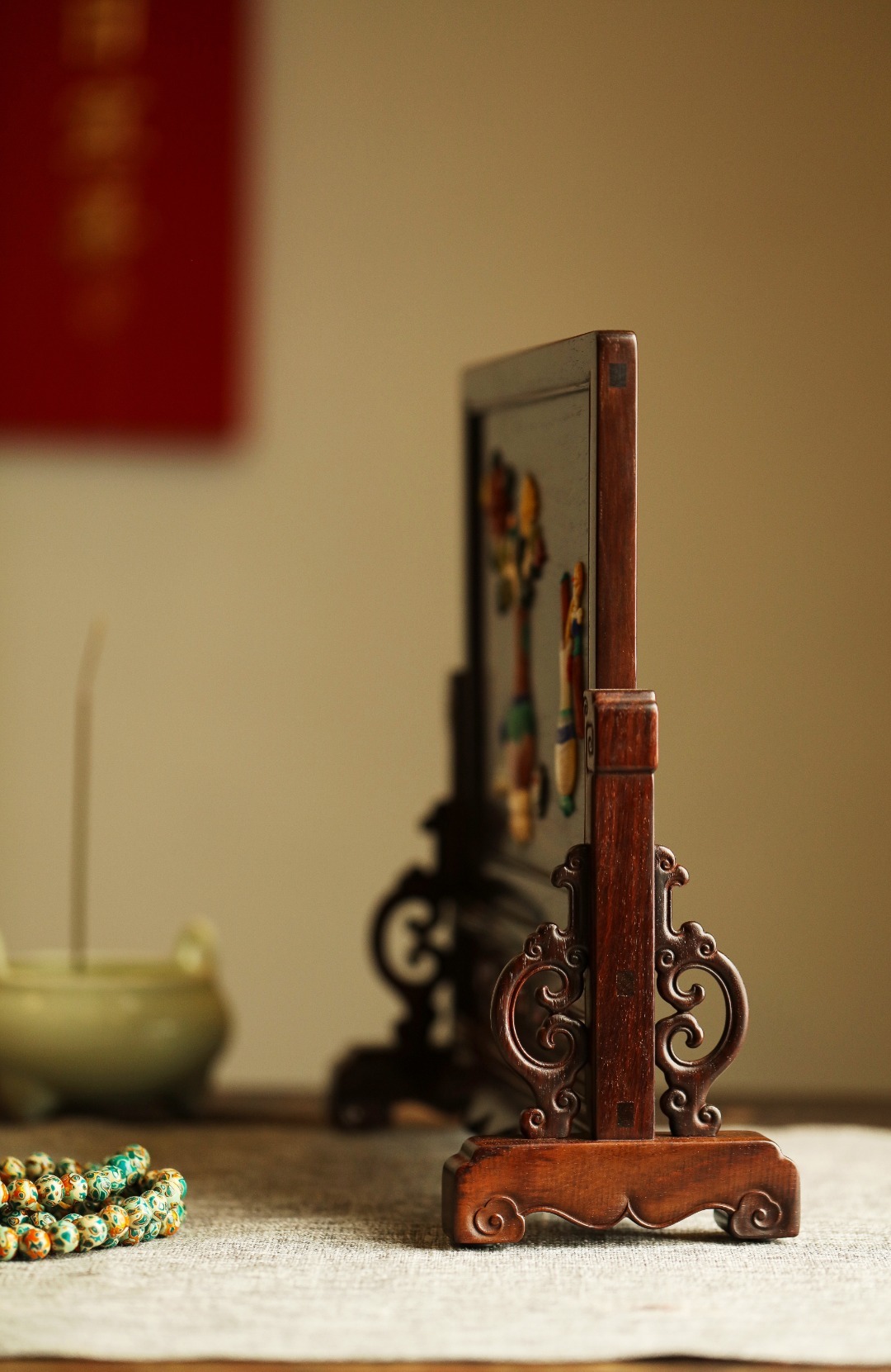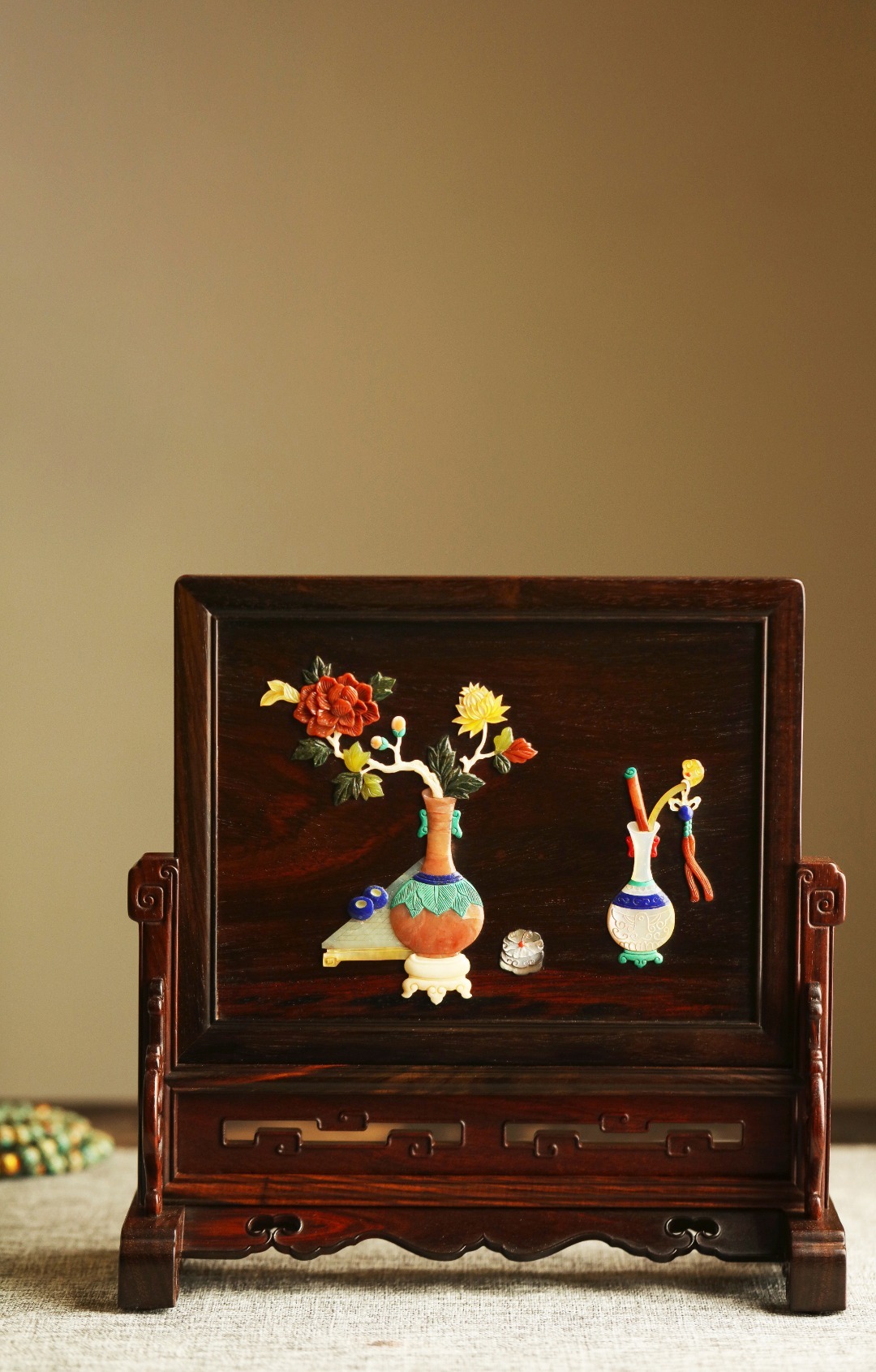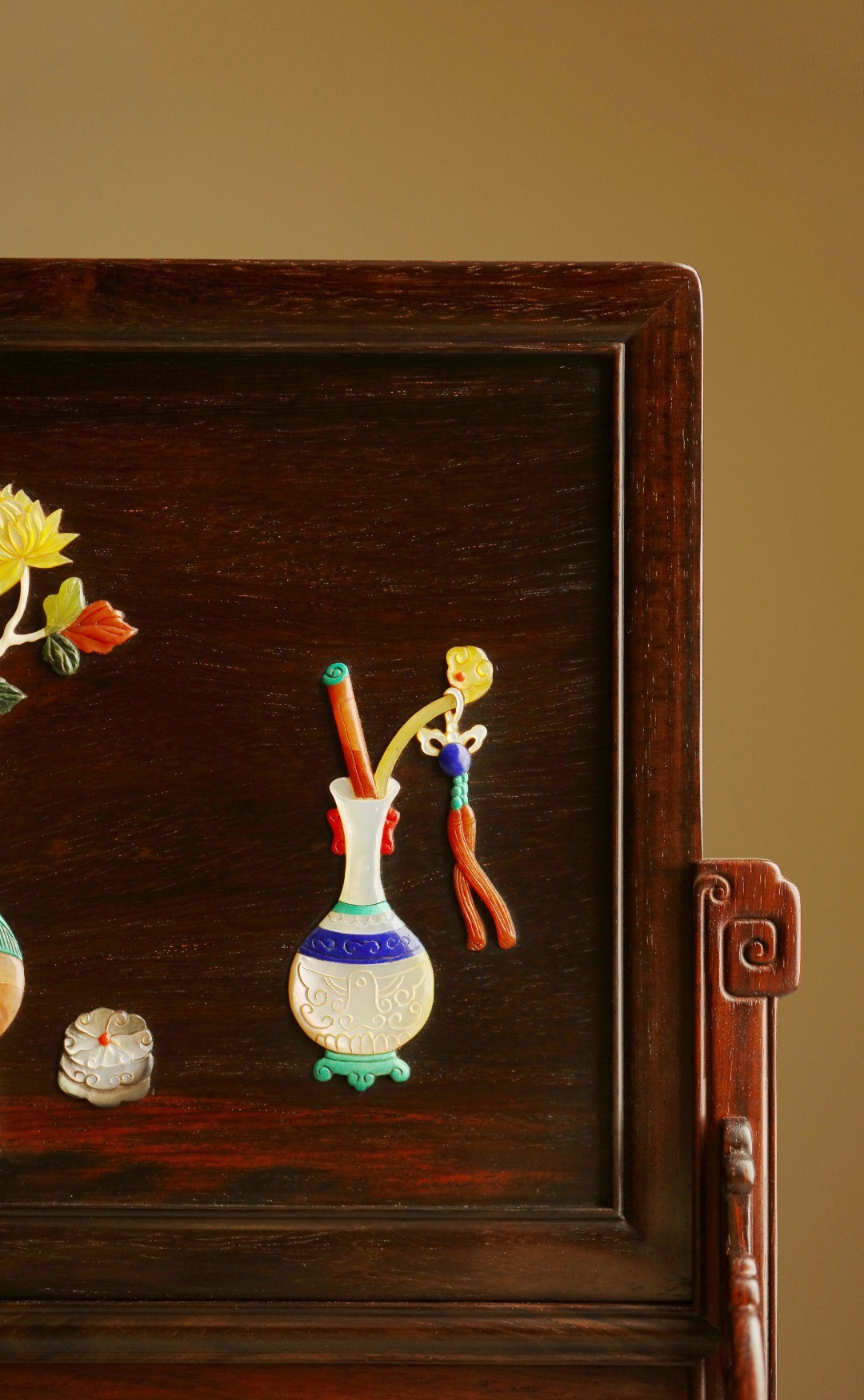酸枝镶嵌百宝嵌博古图,端庄古雅,寓意祥瑞;置案清赏,添祥和雅意。