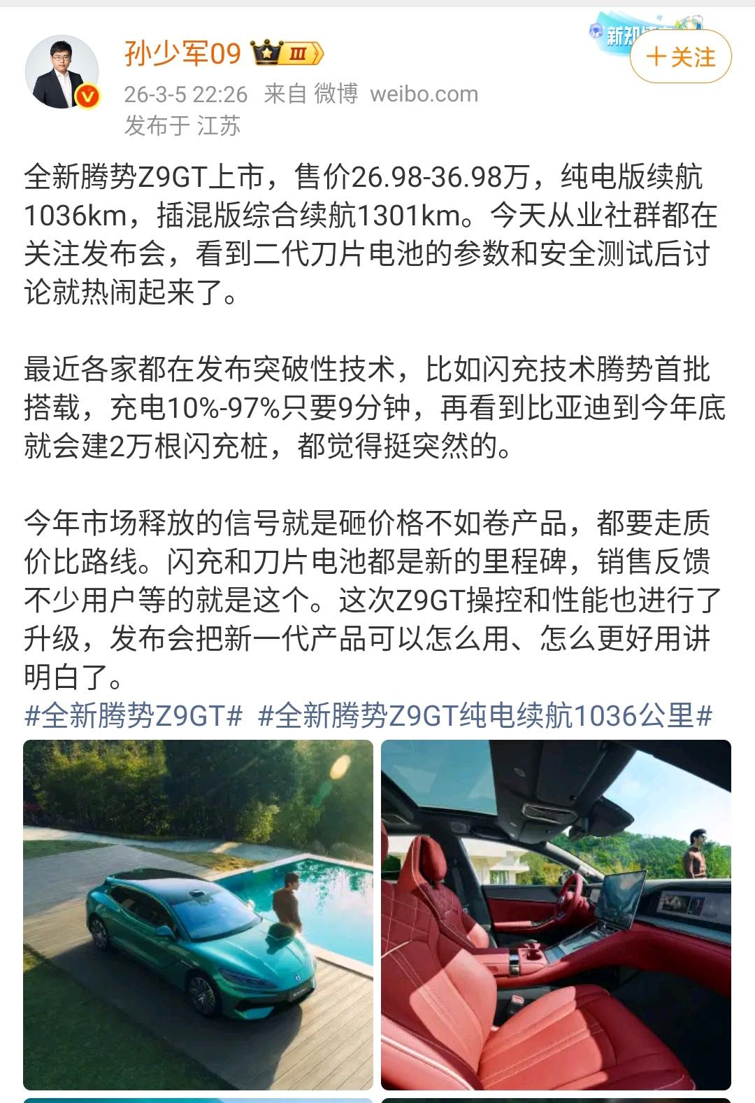 孙少军:全新腾势Z9GT上市,售价26.98-36.98万! 这个车引人注目,更引人注目的是发布的第2代刀片电池和比亚迪将在今年年底实现2万个闪充桩! 2万个超充桩数量确实是比较多的,考虑到比亚迪车型巨大的保有量,自建充电桩带来的优势是是用其他品牌所无法比拟的。 自营充电桩也相当于为比亚迪增加了一个新的收入模块,毕竟短时间内充入更多的电能收入更多的钱。