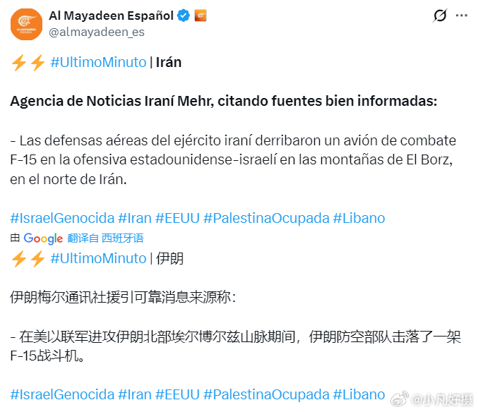 【伊朗称击落一架美军F15战斗机】据伊朗迈赫尔通讯社5日报道,伊朗防空部队在厄尔布尔士山脉击落一架美军F-15战斗机。美以伊最新局势黄媒不会说的真相