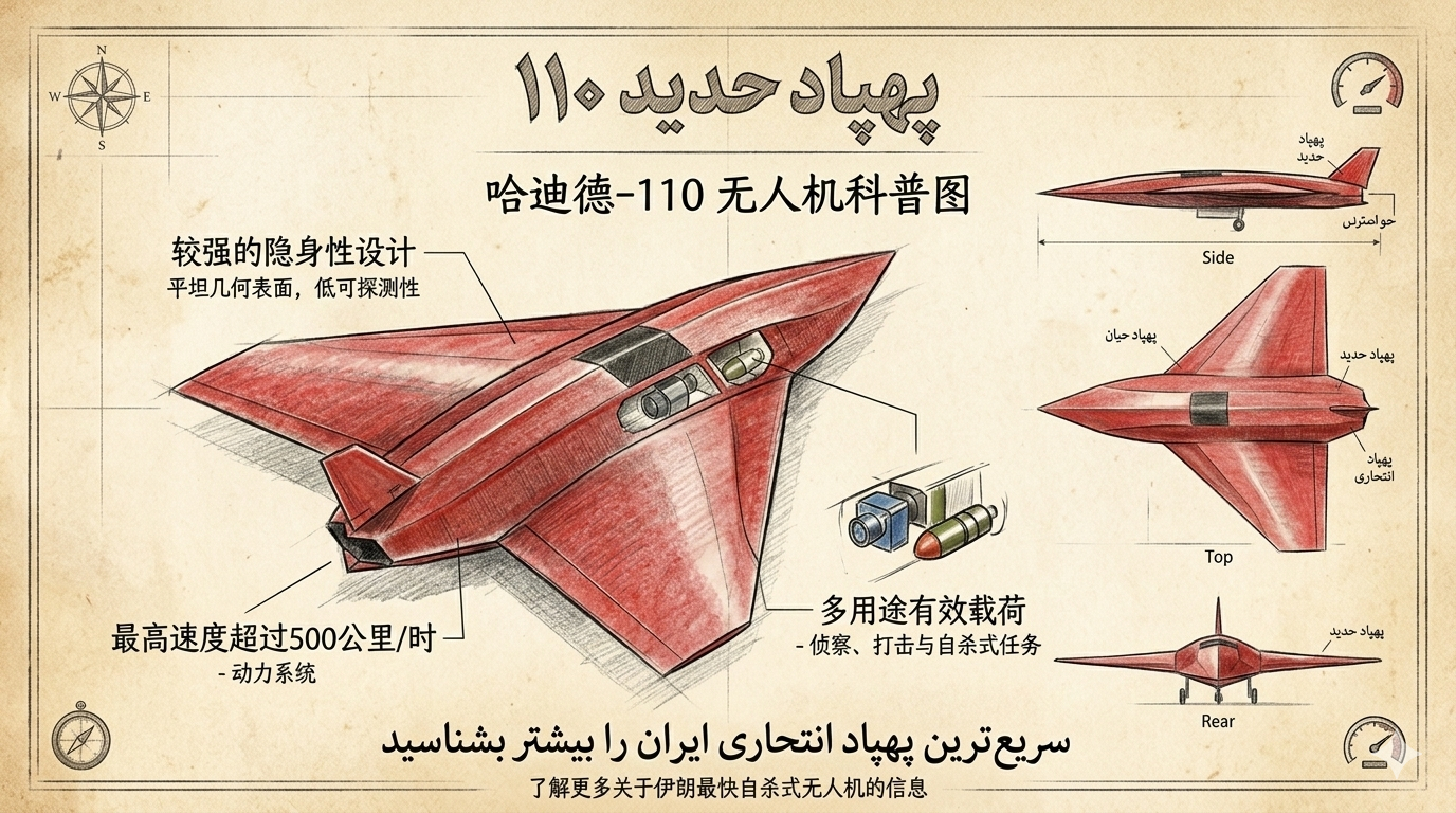 “哈迪德-110”(Hadid-110) 是伊朗伊斯兰革命卫队地面部队装备的一款新型喷气动力隐身自杀式攻击无人机。它是伊朗目前速度最快的自杀式无人机,最高速度超过510 km/h,是沙赫德-136的近3倍,能大幅压缩敌方防空系统的反应时间。